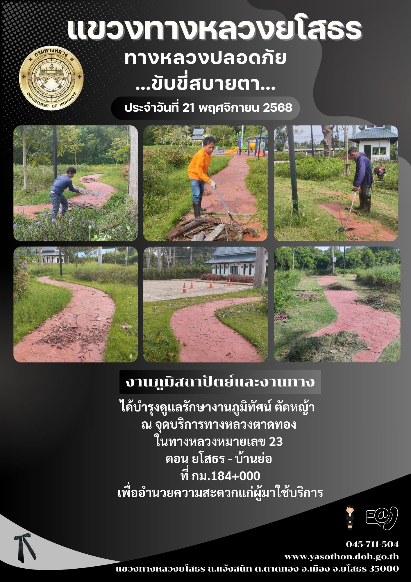 วันที่ 21 พฤศจิกายน 2568 งานภูมิสถาปัตย์และงานทาง ได้บำรุงดูแลรักษางานภูมิทัศน์ ตัดหญ้า ณ จุดบริการทางหลวงตาดทอง ในทางหลวงหมายเลข 23 ตอน ยโสธร - บ้านย่อ ที่ กม.184+000 เพื่ออำนวยความสะดวกแก่ผู้มาใช้บริการ