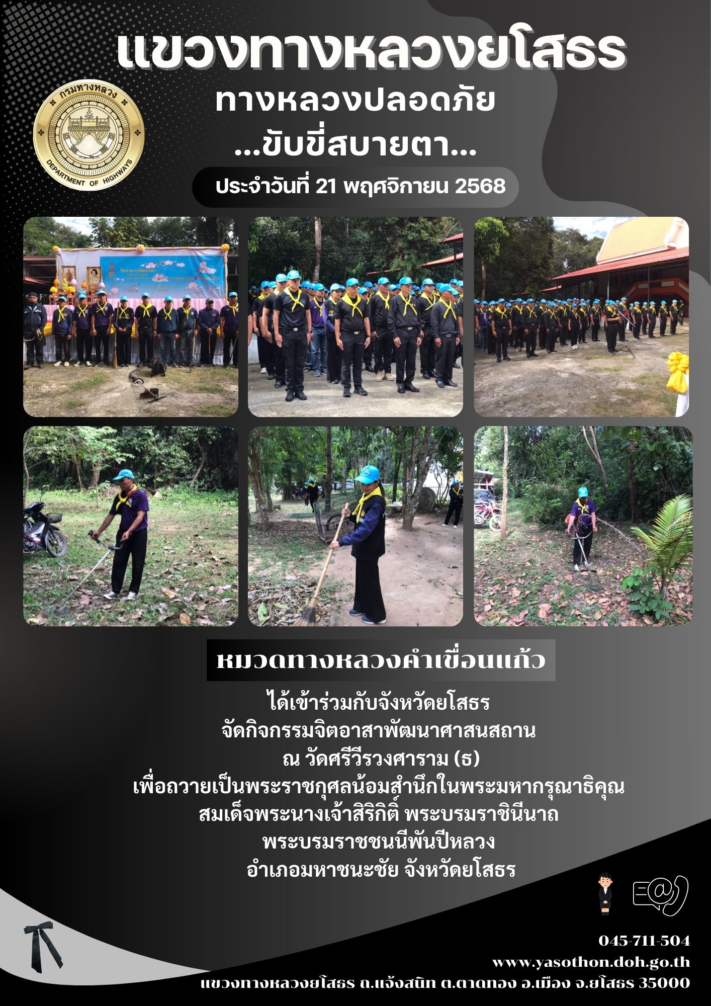 วันที่ 21 พฤศจิกายน 2568 หมวดทางหลวงคำเขื่อนแก้ว ได้เข้าร่วมกับจังหวัดยโสธร จัดกิจกรรมจิตอาสาพัฒนาศาสนสถาน ณ วัดศรีวีรวงศาราม (ธ) เพื่อถวายเป็นพระราชกุศลน้อมสำนึกในพระมหากรุณาธิคุณ สมเด็จพระนางเจ้าสิริกิติ์ พระบรมราชินีนาถ พระบรมราชชนนีพันปีหลวง