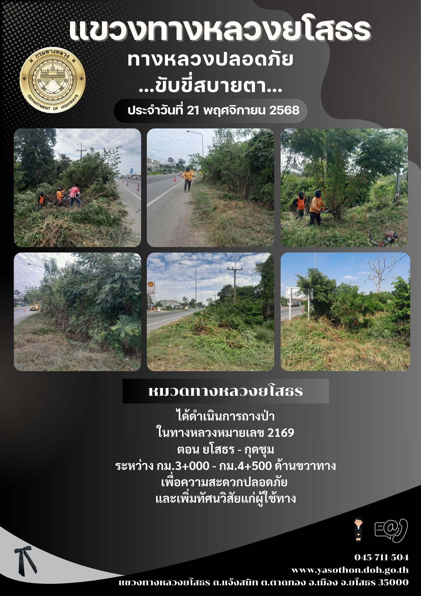วันที่ 21 พฤศจิกายน 2568 หมวดทางหลวงยโสธร ได้ดำเนินการถางป่า ในทางหลวงหมายเลข 2169 ตอน ยโสธร - กุดชุม ระหว่าง กม.3+000 - กม.4+500 ด้านขวาทาง เพื่อความสะดวกปลอดภัย และเพิ่มทัศนวิสัยแก่ผู้ใช้ทาง