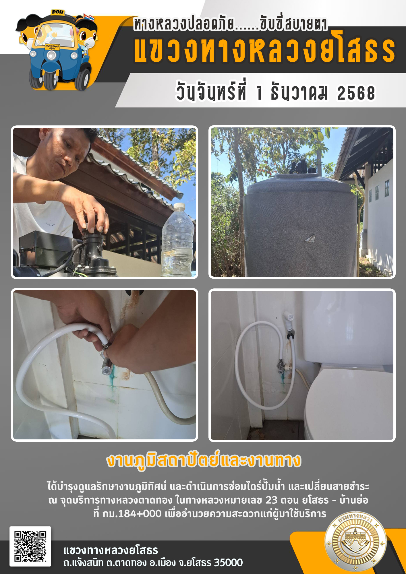 วันจันทร์ที่ 1 ธันวาคม 2568 งานภูมิสถาปัตย์และงานทาง ได้บำรุงดูแลรักษางานภูมิทัศน์ และดำเนินการซ่อมไดร่ปั้มน้ำ และเปลี่ยนสายชำระ ณ จุดบริการทางหลวงตาดทอง ในทางหลวงหมายเลข 23 ตอน ยโสธร - บ้านย่อ ที่ กม.184+000 เพื่ออำนวยความสะดวกแก่ผู้มาใช้บริการ