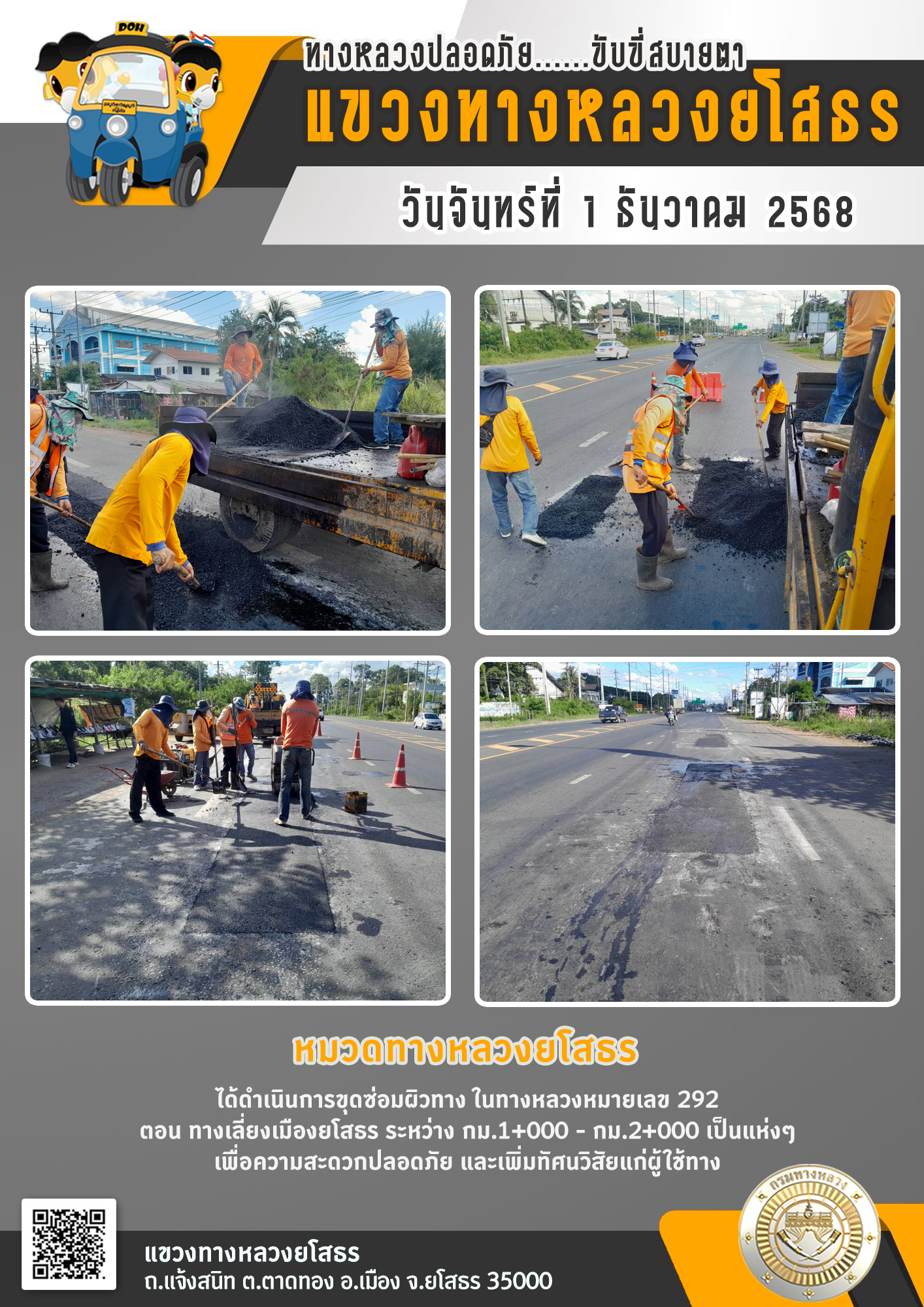 วันจันทร์ที่ 1 ธันวาคม 2568 หมวดทางหลวงยโสธร ได้ดำเนินการขุดซ่อมผิวทาง ในทางหลวงหมายเลข 292 ตอน ทางเลี่ยงเมืองยโสธร ระหว่าง กม.1+000 - กม.2+000 เป็นแห่งๆ เพื่อความสะดวกปลอดภัย และเพิ่มทัศนวิสัยแก่ผู้ใช้ทาง