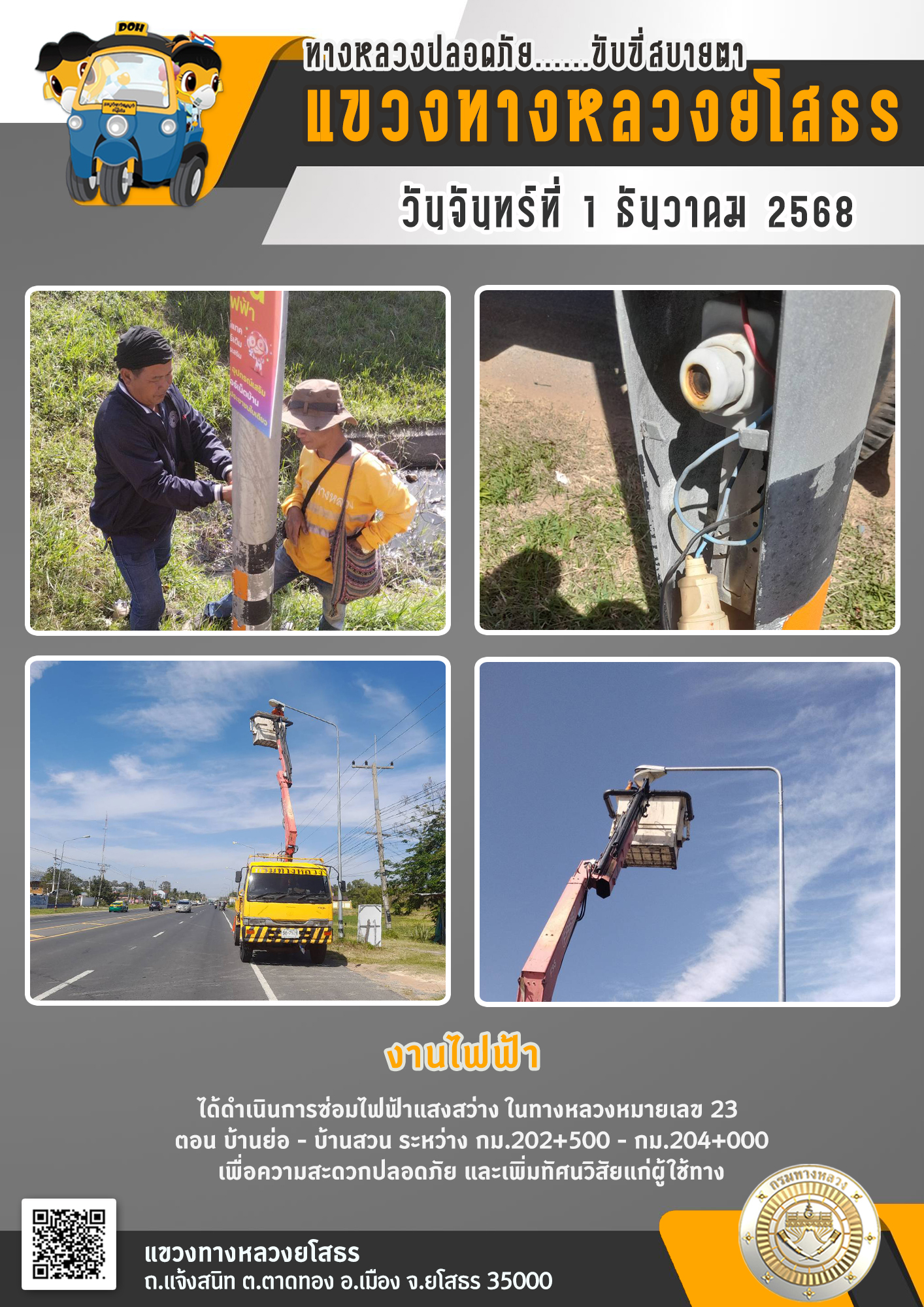 วันจันทร์ที่ 1 ธันวาคม 2568 งานไฟฟ้า ได้ดำเนินการซ่อมไฟฟ้าแสงสว่าง ในทางหลวงหมายเลข 23 ตอน บ้านย่อ - บ้านสวน ระหว่าง กม.202+500 - กม.204+000 เพื่อความสะดวกปลอดภัย และเพิ่มทัศนวิสัยแก่ผู้ใช้ทาง