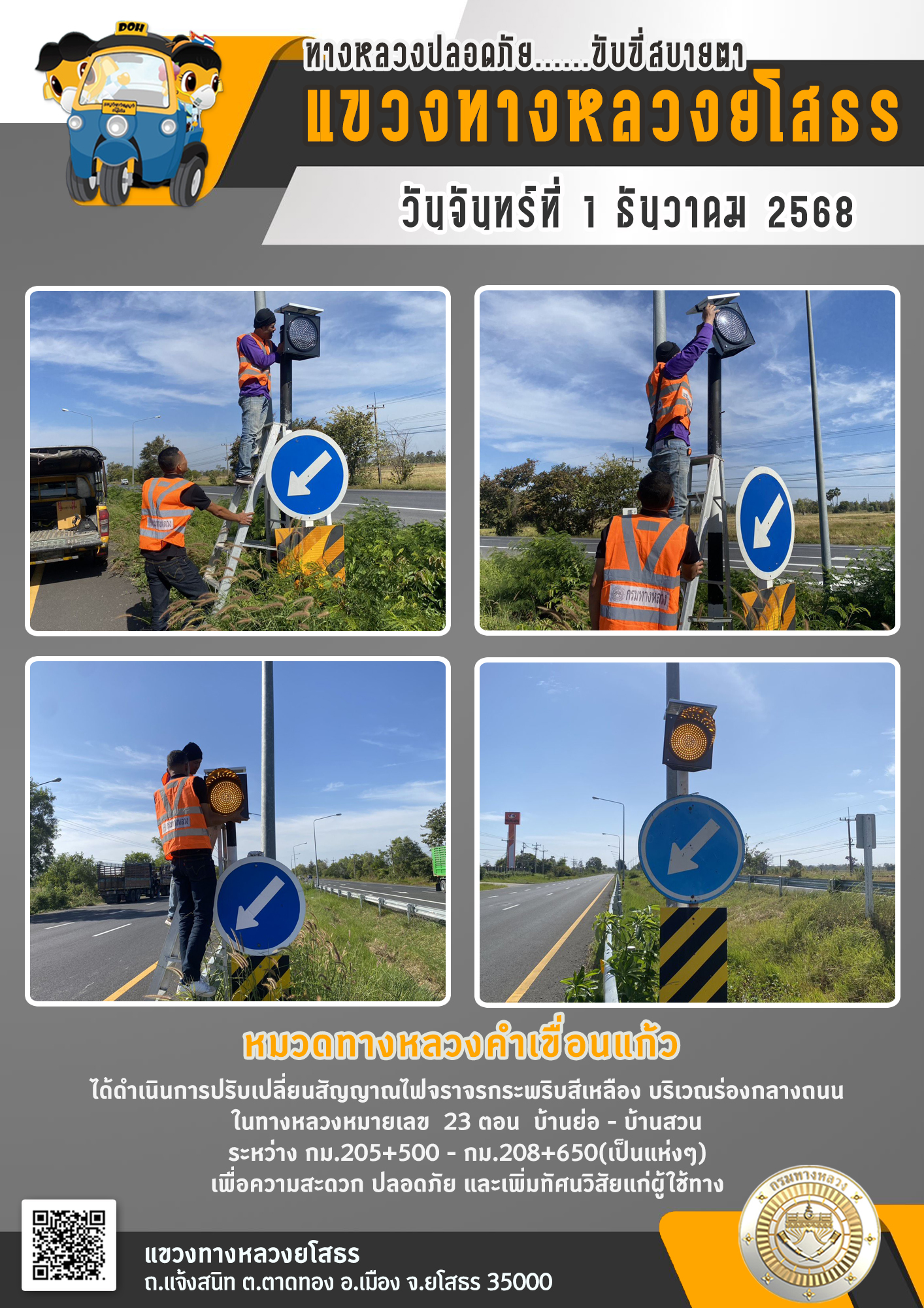 วันจันทร์ที่ 1 ธันวาคม 2568 หมวดทางหลวงคำเขื่อนแก้ว ได้ดำเนินการปรับเปลี่ยนสัญญาณไฟจราจรกระพริบสีเหลือง บริเวณร่องกลางถนน ในทางหลวงหมายเลข 23 ตอน บ้านย่อ - บ้านสวน ระหว่าง กม.205+500 - กม.208+650(เป็นแห่งๆ)