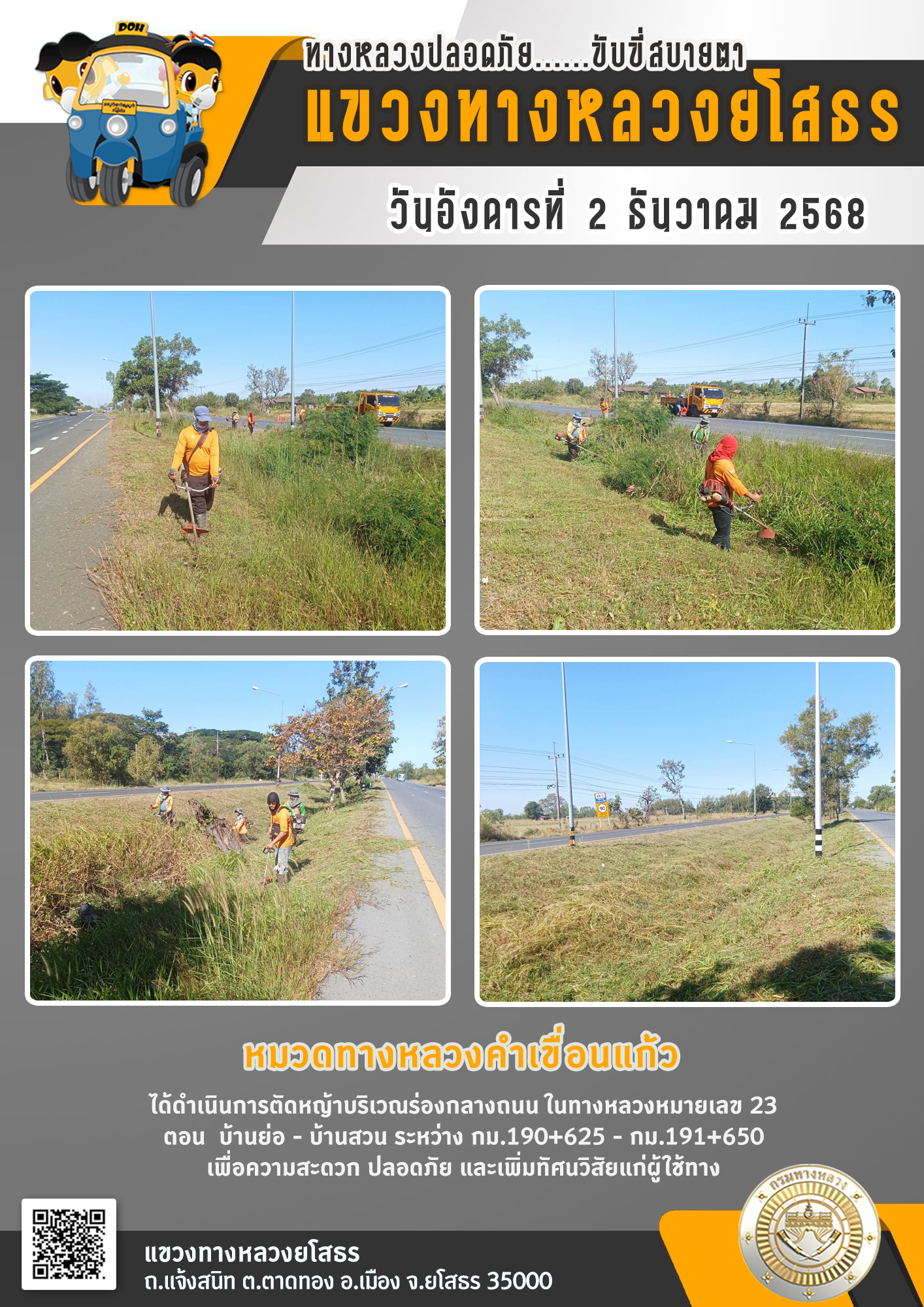 วันอังคารที่ 2 ธันวาคม 2568 หมวดทางหลวงคำเขื่อนแก้ว ได้ดำเนินการตัดหญ้าบริเวณร่องกลางถนน ในทางหลวงหมายเลข 23 ตอน บ้านย่อ - บ้านสวน ระหว่าง กม.190+625 - กม.191+650 เพื่อความสะดวก ปลอดภัย และเพิ่มทัศนวิสัยแก่ผู้ใช้ทาง