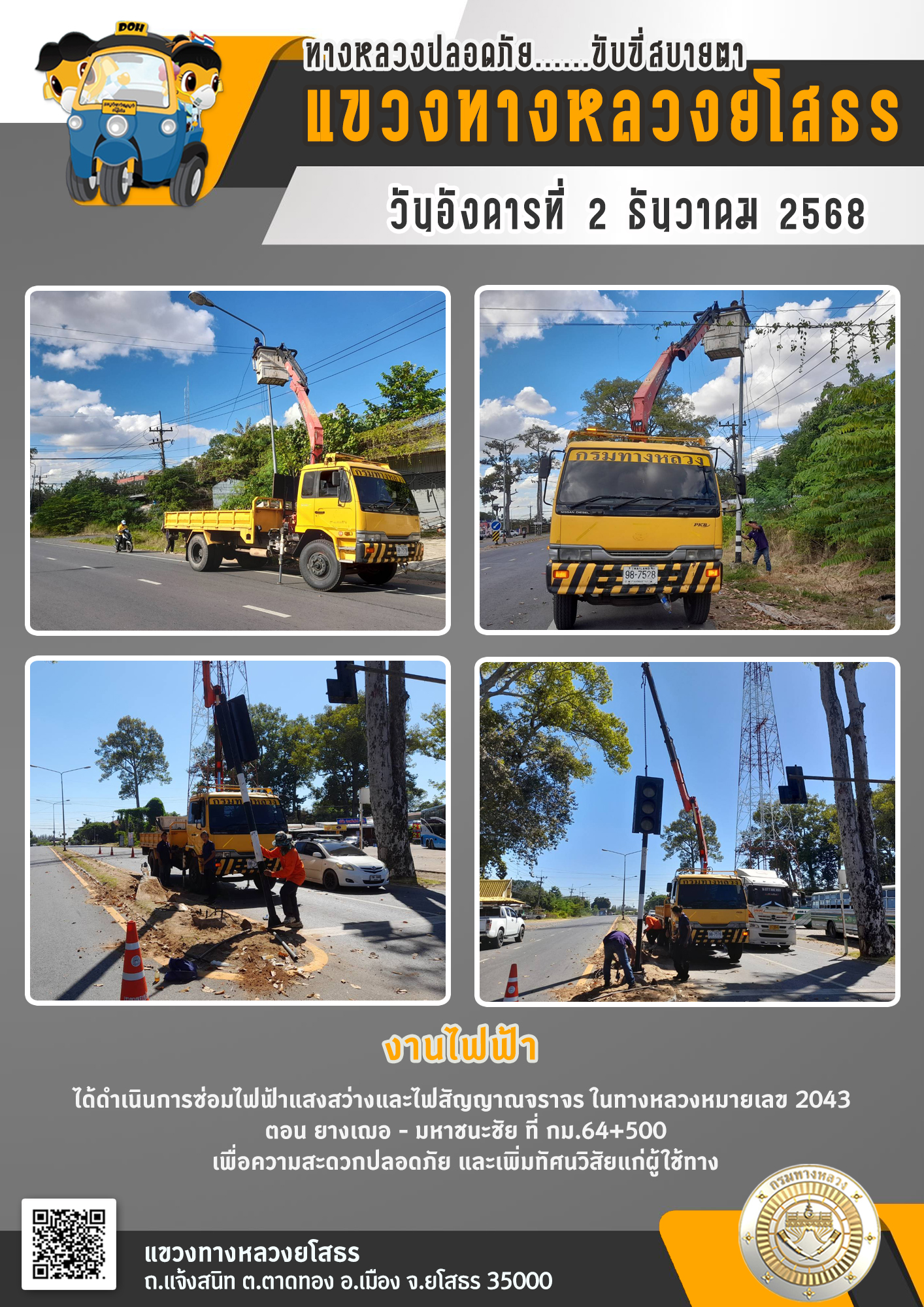 วันอังคารที่ 2 ธันวาคม 2568 งานไฟฟ้า ได้ดำเนินการซ่อมไฟฟ้าแสงสว่างและไฟสัญญาณจราจร ในทางหลวงหมายเลข 2043 ตอน ยางเฌอ - มหาชนะชัย ที่ กม.64+500 เพื่อความสะดวกปลอดภัย และเพิ่มทัศนวิสัยแก่ผู้ใช้ทาง