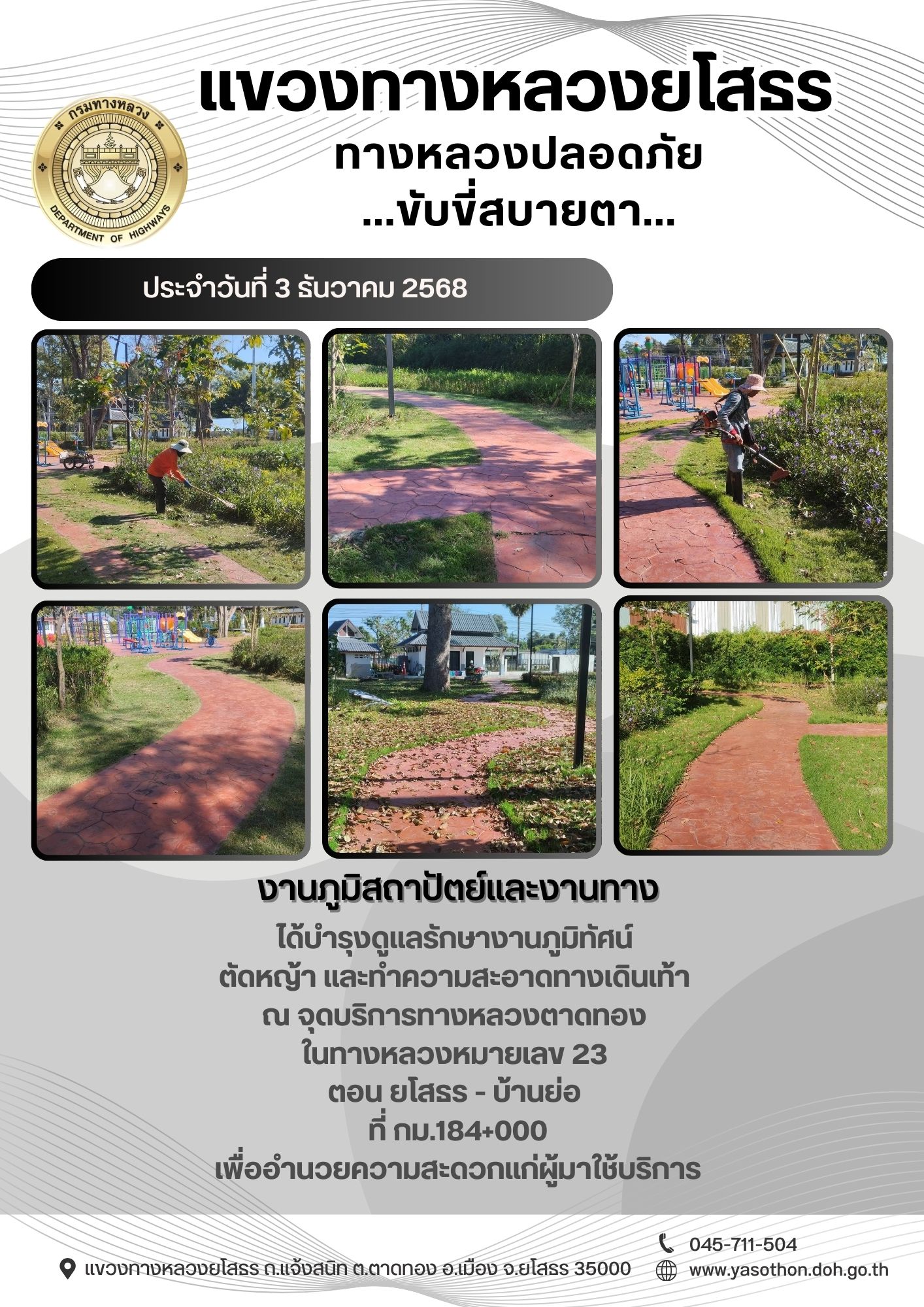วันพุธที่ 3 ธันวาคม 2568 งานภูมิสถาปัตย์และงานทาง ได้บำรุงดูแลรักษางานภูมิทัศน์ ตัดหญ้า และทำความสะอาดทางเดินเท้า ณ จุดบริการทางหลวงตาดทอง ในทางหลวงหมายเลข 23 ตอน ยโสธร - บ้านย่อ ที่ กม.184+000 เพื่ออำนวยความสะดวกแก่ผู้มาใช้บริการ