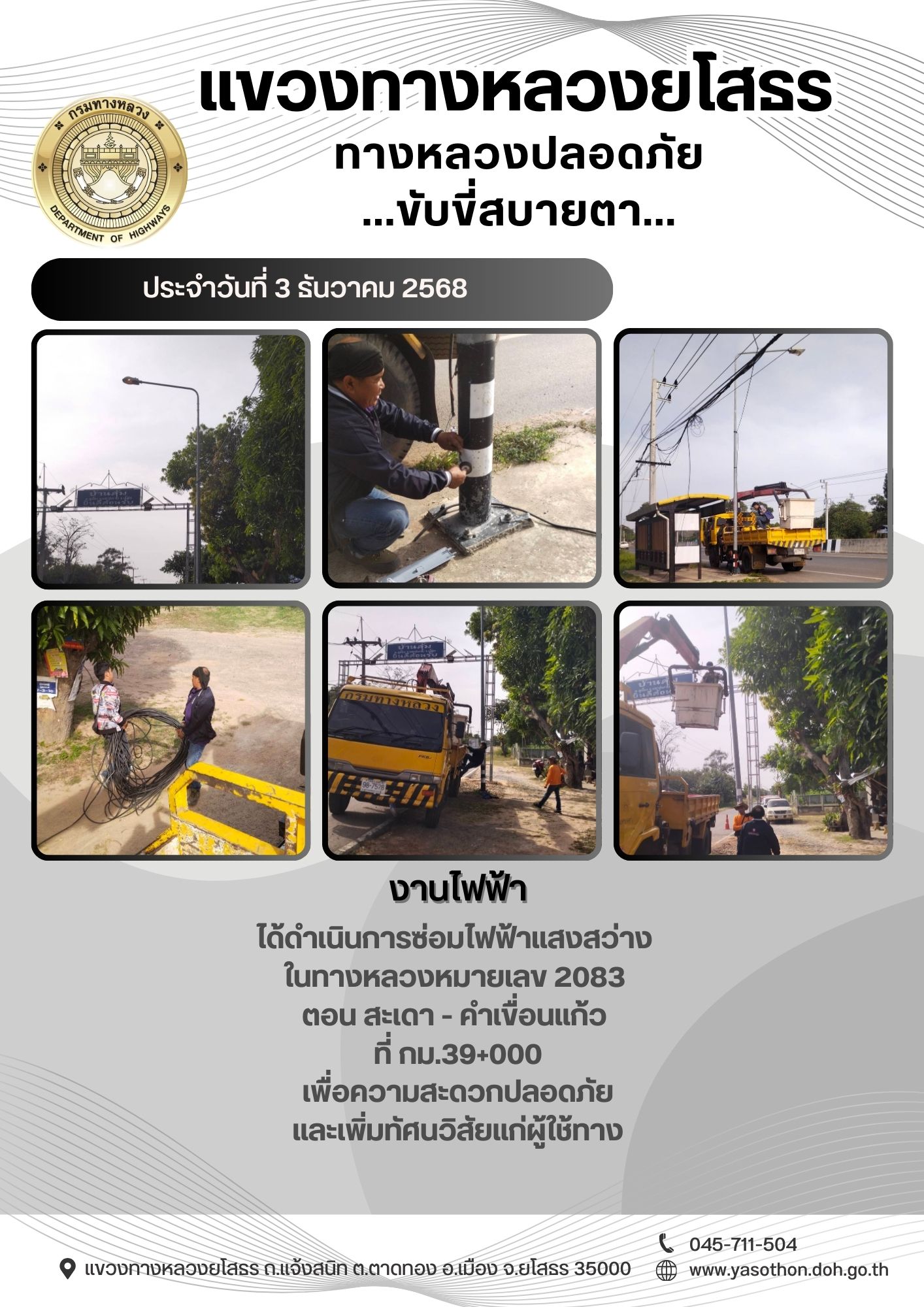 วันพุธที่ 3 ธันวาคม 2568 งานไฟฟ้า ได้ดำเนินการซ่อมไฟฟ้าแสงสว่าง ในทางหลวงหมายเลข 2083 ตอน สะเดา - คำเขื่อนแก้ว ที่ กม.39+000 เพื่อความสะดวกปลอดภัย และเพิ่มทัศนวิสัยแก่ผู้ใช้ทาง