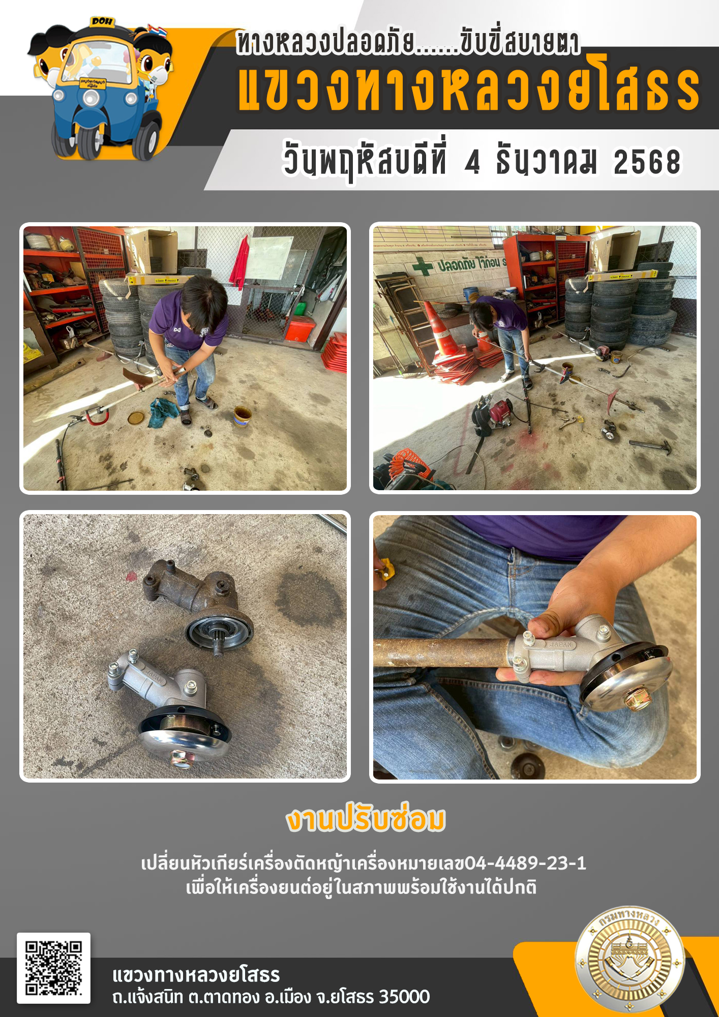 วันพฤหัสบดีที่ 4 ธันวาคม 2568 งานปรับซ่อม เปลี่ยนหัวเกียร์เครื่องตัดหญ้าเครื่องหมายเลข 04-4489-23-1 เพื่อให้อยู่ในสภาพพร้อมใช้งานได้ปกติ