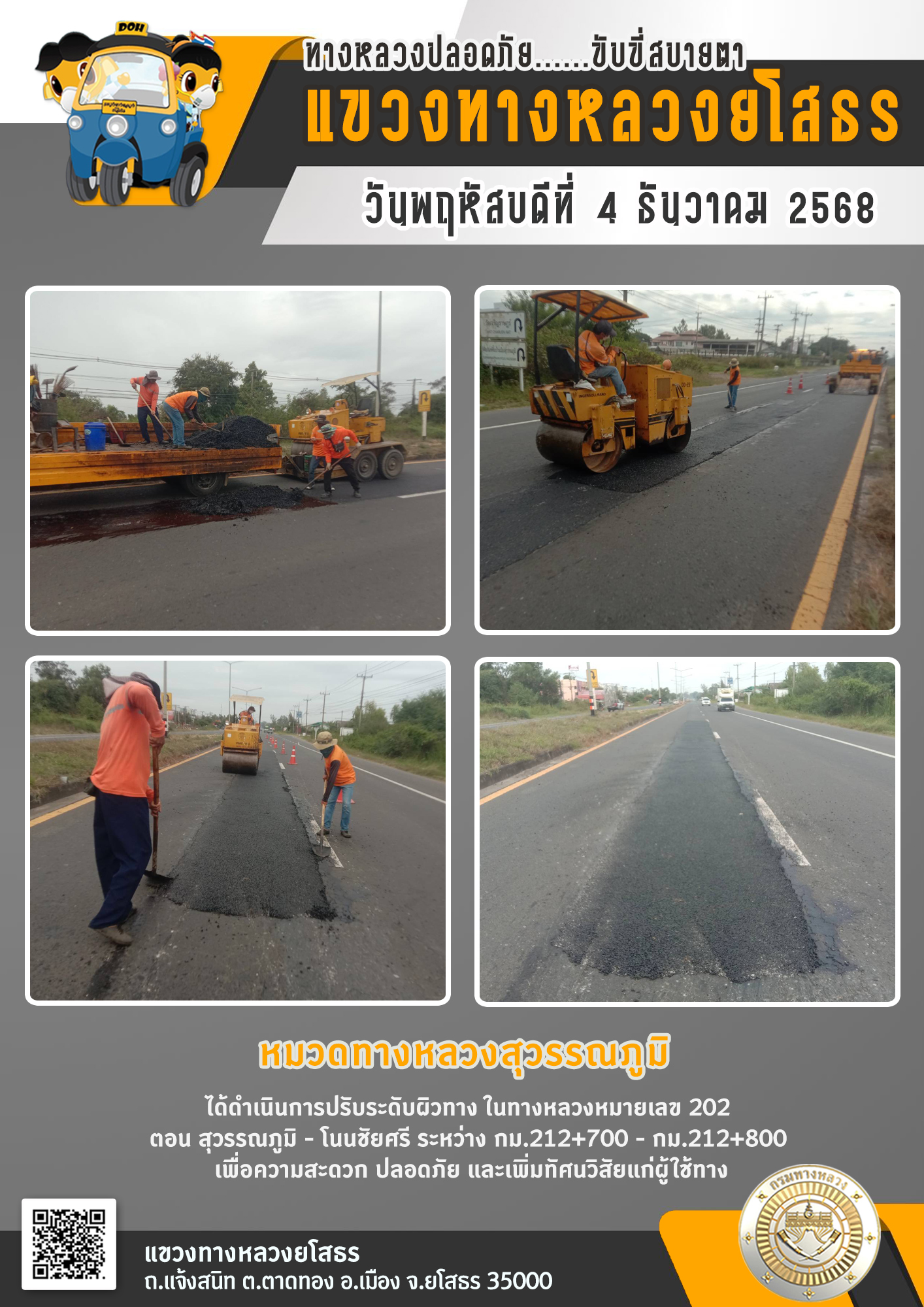 วันพฤหัสบดีที่ 4 ธันวาคม 2568 หมวดทางหลวงสุวรรณภูมิ ได้ดำเนินการปรับระดับผิวทาง ในทางหลวงหมายเลข 202 ตอน สุวรรณภูมิ - โนนชัยศรี ระหว่าง กม.212+700 - กม.212+800 เพื่อความสะดวก ปลอดภัย และเพิ่มทัศนวิสัยแก่ผู้ใช้ทาง