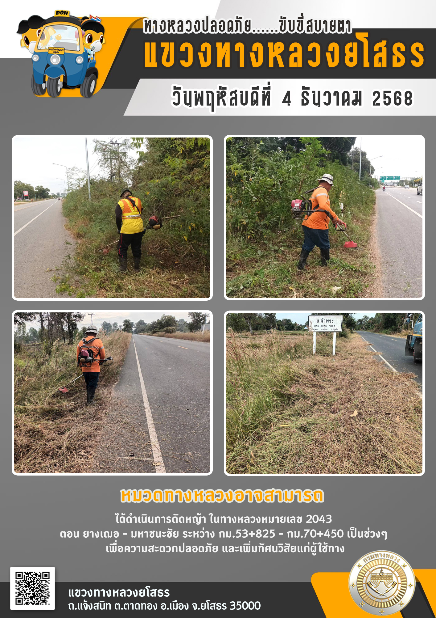 วันพฤหัสบดีที่ 4 ธันวาคม 2568 หมวดทางหลวงอาจสามารถ ได้ดำเนินการตัดหญ้า ในทางหลวงหมายเลข 2043 ตอน ยางเฌอ - มหาชนะชัย ระหว่าง กม.53+825 - กม.70+450 เป็นช่วงๆ เพื่อความสะดวกปลอดภัย และเพิ่มทัศนวิสัยแก่ผู้ใช้ทาง