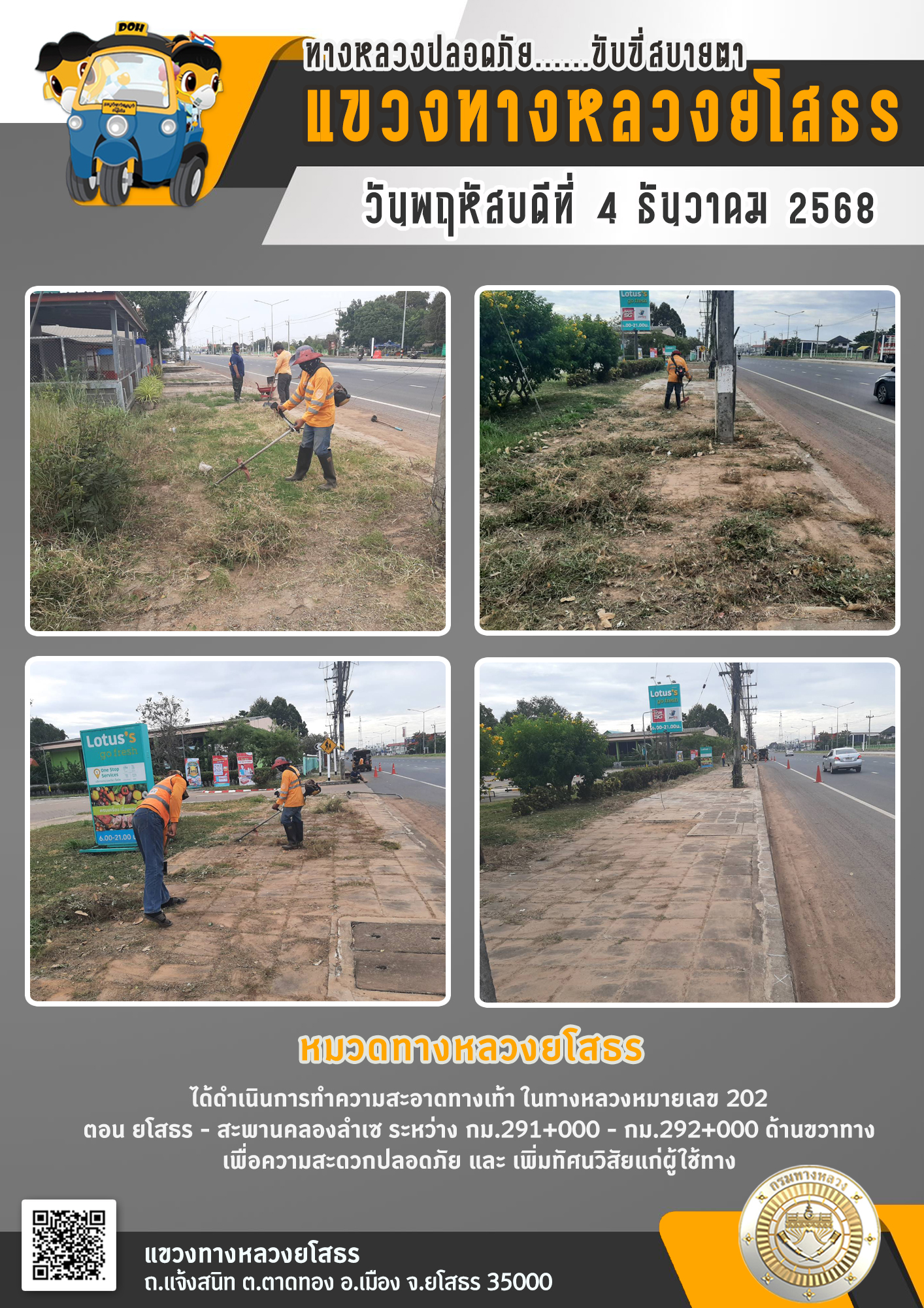 วันพฤหัสบดีที่ 4 ธันวาคม 2568 หมวดทางหลวงยโสธร ได้ดำเนินการทำความสะอาดทางเท้า ในทางหลวงหมายเลข 202 ตอน ยโสธร - สะพานคลองลำเซ ระหว่าง กม.291+000 - กม.292+000 ด้านขวาทาง เพื่อความสะดวกปลอดภัย และเพิ่มทัศนวิสัยแก่ผู้ใช้ทาง