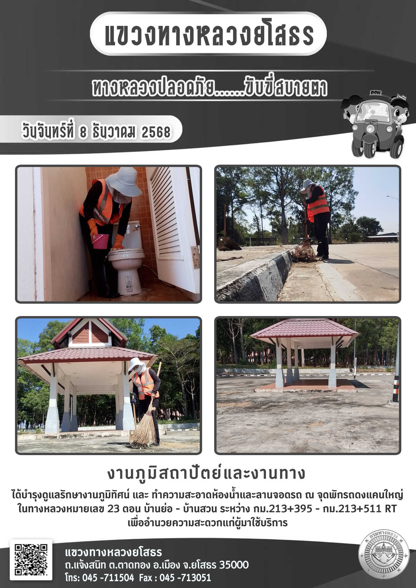 วันจันทร์ที่ 8 ธันวาคม 2568 งานภูมิสถาปัตย์และงานทาง ได้บำรุงดูแลรักษางานภูมิทัศน์ และทำความสะอาดห้องน้ำและลานจอดรถ ณ จุดพักรถดงแคนใหญ่ ในทางหลวงหมายเลข 23 ตอน บ้านย่อ - บ้านสวน ระหว่าง กม.213+395 - กม.213+511 RT เพื่ออำนวยความสะดวกแก่ผู้มาใช้บริการ