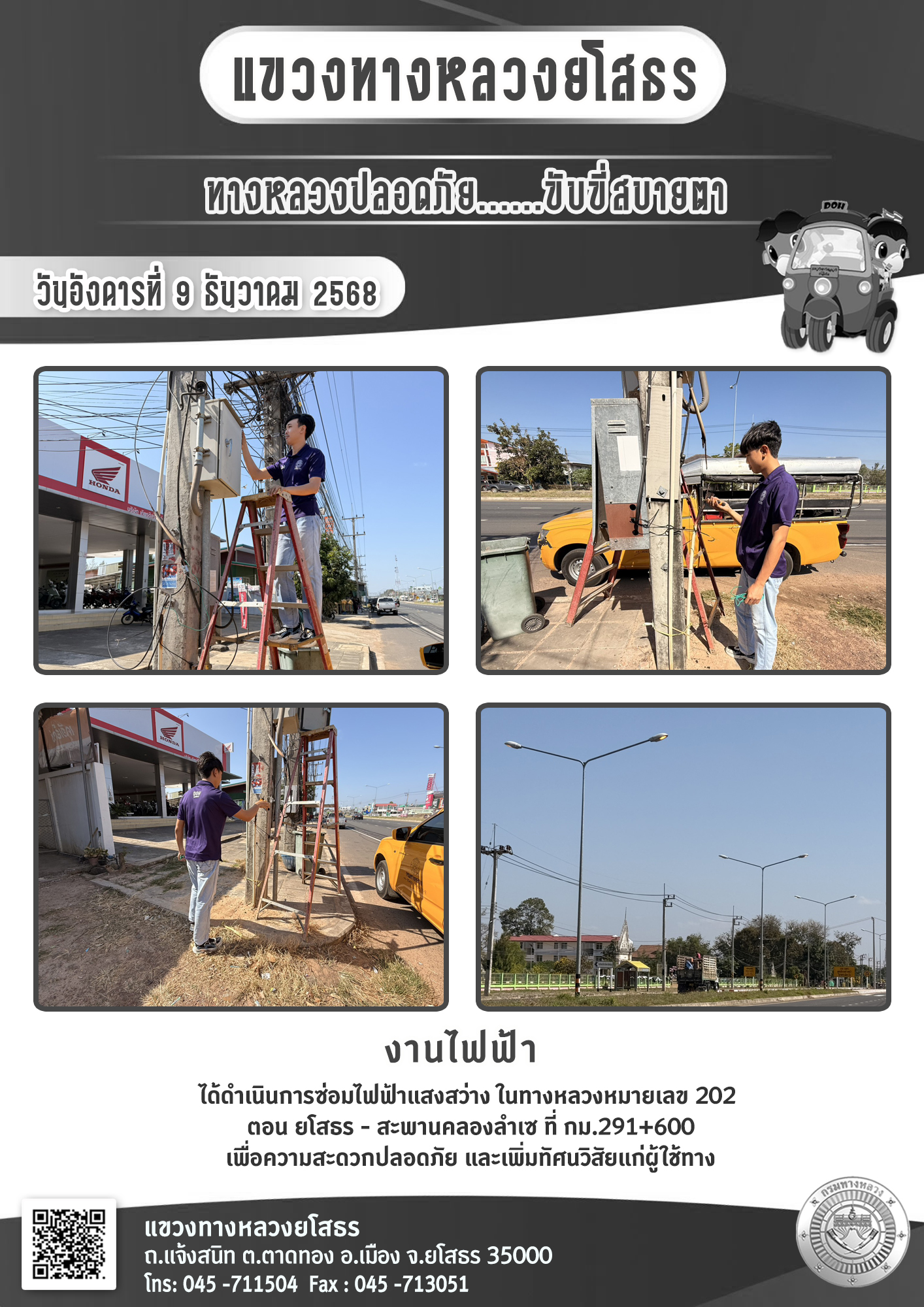 วันอังคารที่ 9 ธันวาคม 2568 งานไฟฟ้า ได้ดำเนินการซ่อมไฟฟ้าแสงสว่าง ในทางหลวงหมายเลข 202 ตอน ยโสธร - สะพานคลองลำเซ ที่ กม.291+600 เพื่อความสะดวกปลอดภัย และเพิ่มทัศนวิสัยแก่ผู้ใช้ทาง