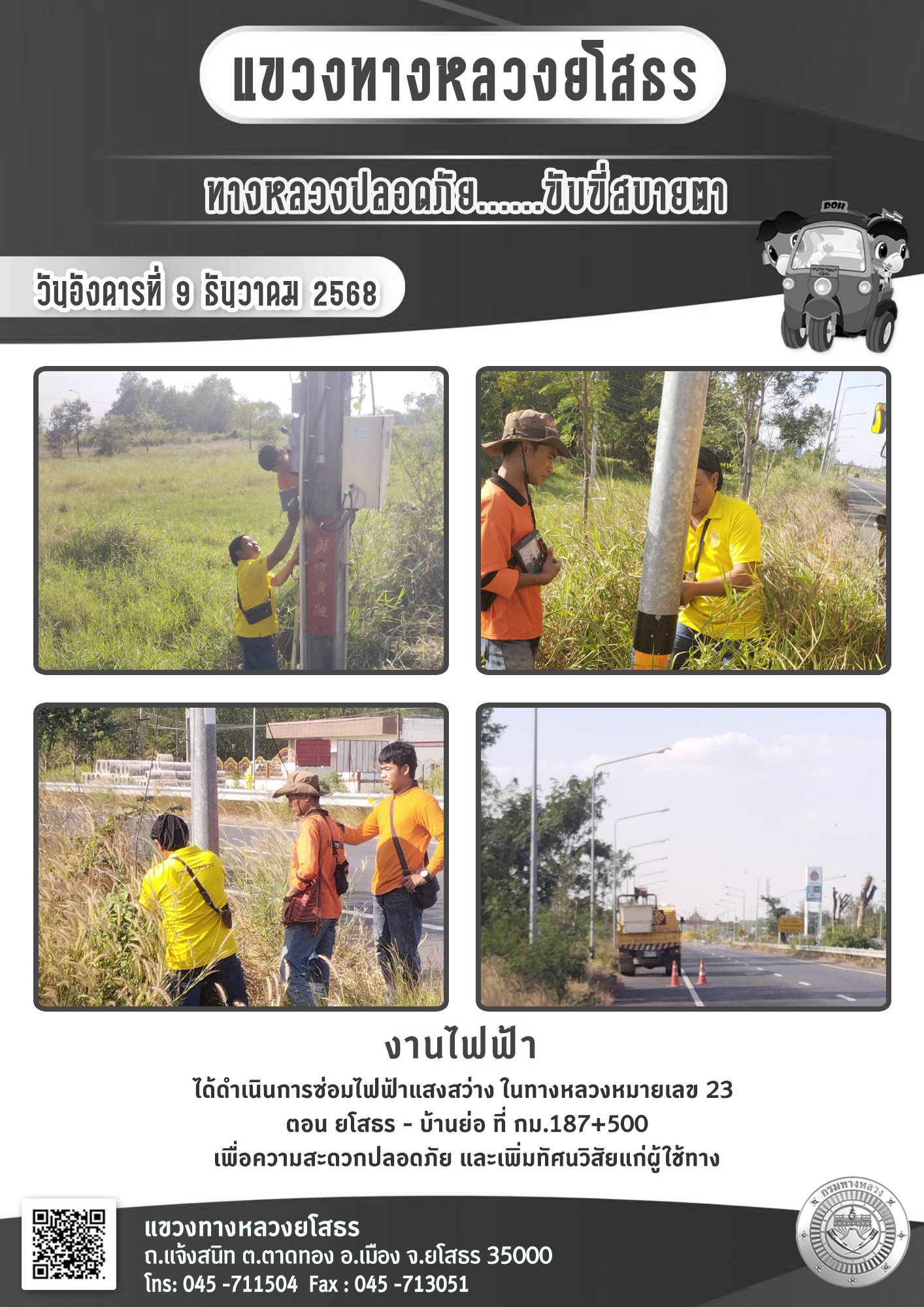 วันอังคารที่ 9 ธันวาคม 2568 งานไฟฟ้า ได้ดำเนินการซ่อมไฟฟ้าแสงสว่าง ในทางหลวงหมายเลข 23 ตอน ยโสธร - บ้านย่อ ที่ กม.187+500 เพื่อความสะดวกปลอดภัย และเพิ่มทัศนวิสัยแก่ผู้ใช้ทาง
