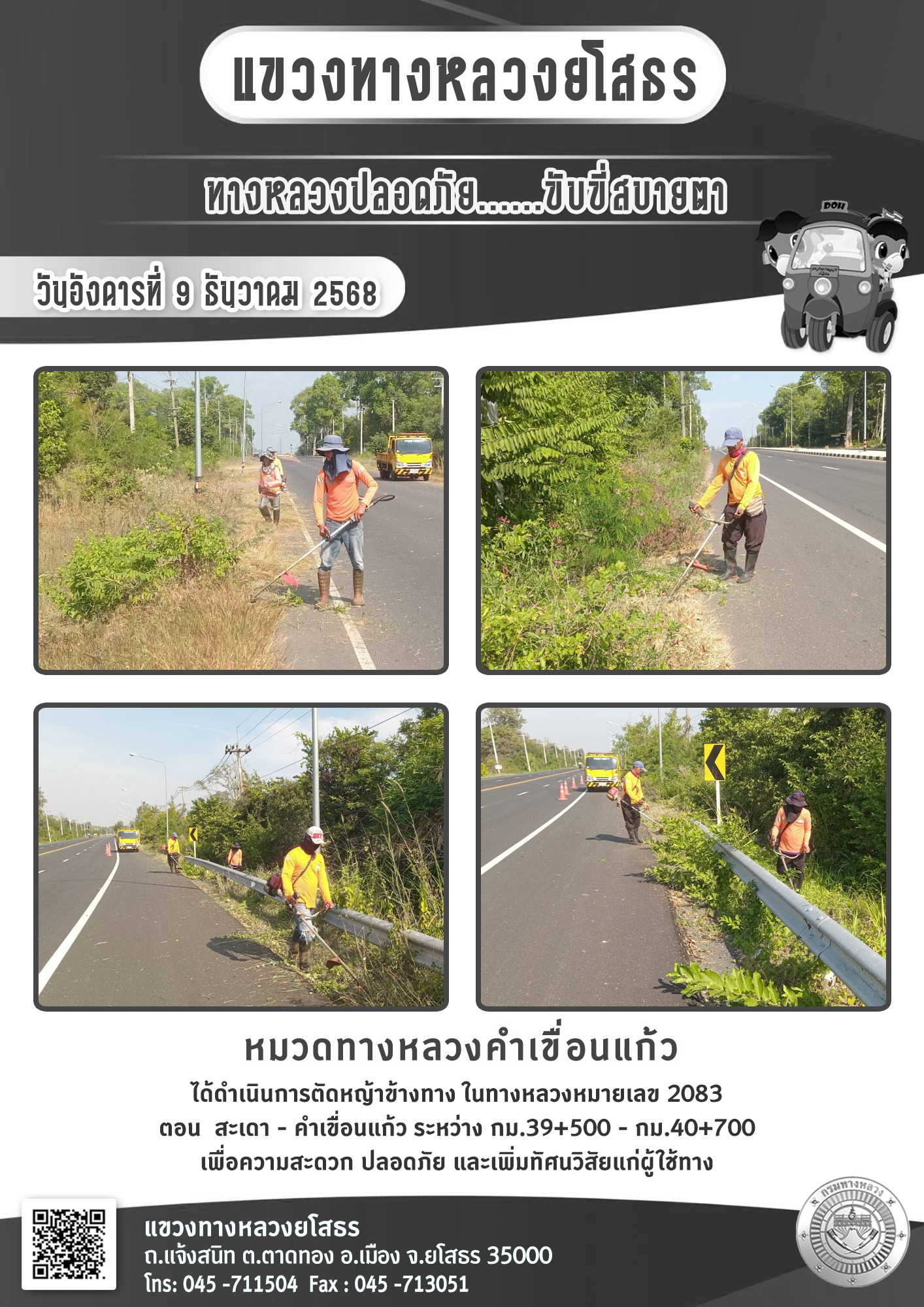 วันอังคารที่ 9 ธันวาคม 2568 หมวดทางหลวงคำเขื่อนแก้ว ได้ดำเนินการตัดหญ้าข้างทาง ในทางหลวงหมายเลข 2083 ตอน สะเดา - คำเขื่อนแก้ว ระหว่าง กม.39+500 - กม.40+700 เพื่อความสะดวก ปลอดภัย และเพิ่มทัศนวิสัยแก่ผู้ใช้ทาง