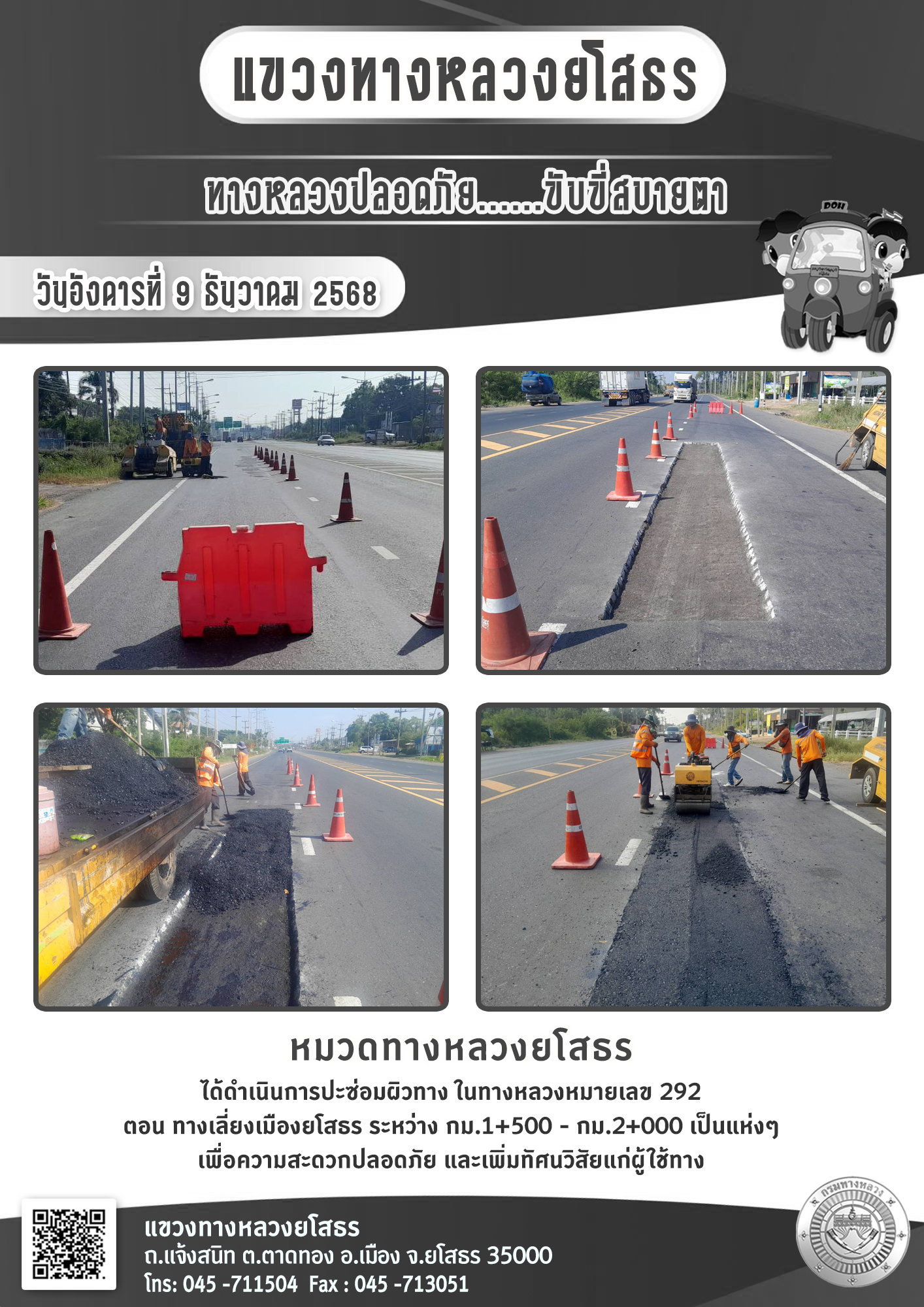 วันอังคารที่ 9 ธันวาคม 2568 หมวดทางหลวงยโสธร ได้ดำเนินการปะซ่อมผิวทาง ในทางหลวงหมายเลข 292 ตอน ทางเลี่ยงเมืองยโสธร ระหว่าง กม.1+500 - กม.2+000 เป็นแห่งๆ เพื่อความสะดวกปลอดภัย และเพิ่มทัศนวิสัยแก่ผู้ใช้ทาง