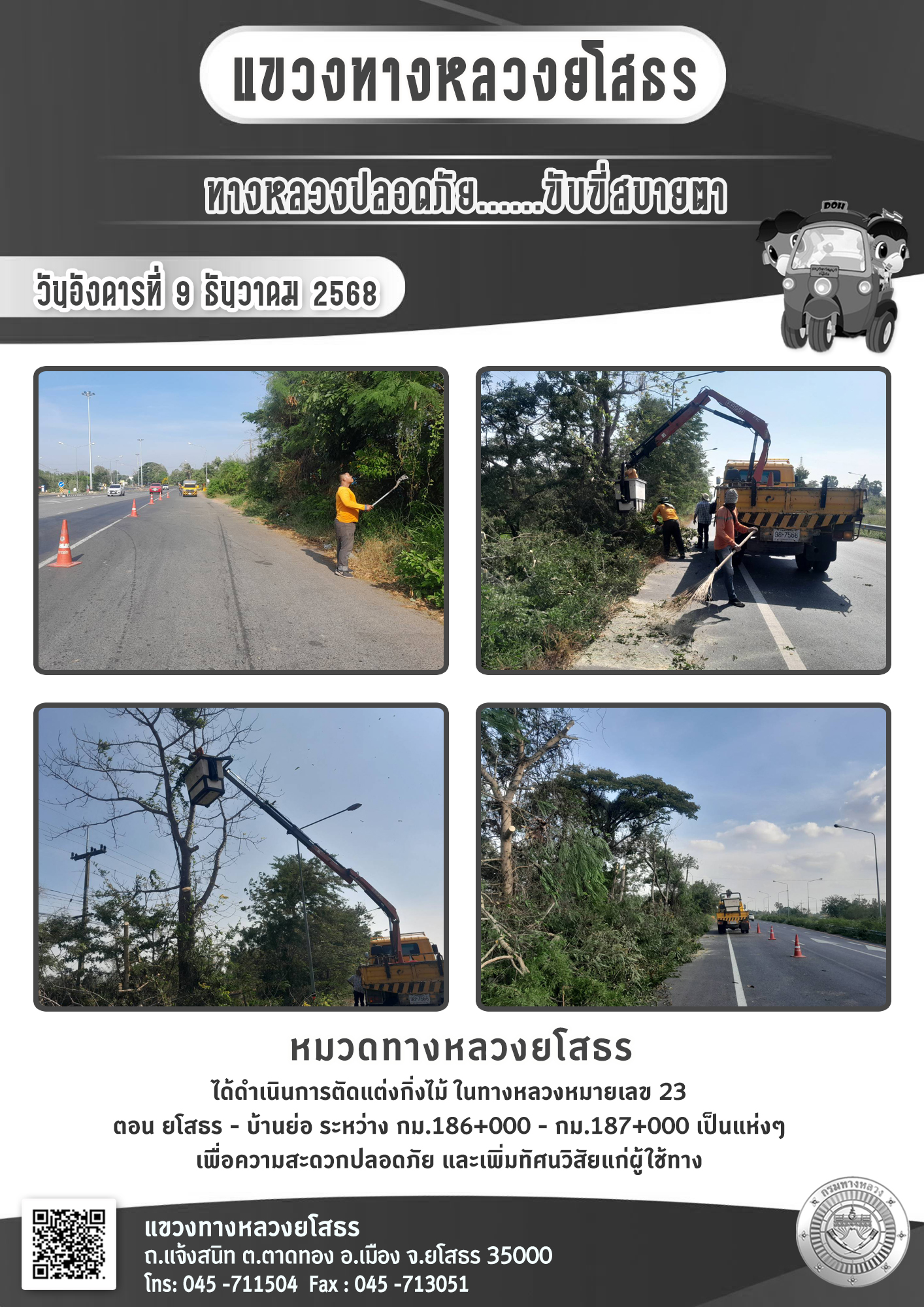 วันอังคารที่ 9 ธันวาคม 2568 หมวดทางหลวงยโสธร ได้ดำเนินการตัดแต่งกิ่งไม้ ในทางหลวงหมายเลข 23 ตอน ยโสธร - บ้านย่อ ระหว่าง กม.186+000 - กม.187+000 เป็นแห่งๆ เพื่อความสะดวกปลอดภัย และเพิ่มทัศนวิสัยแก่ผู้ใช้ทาง