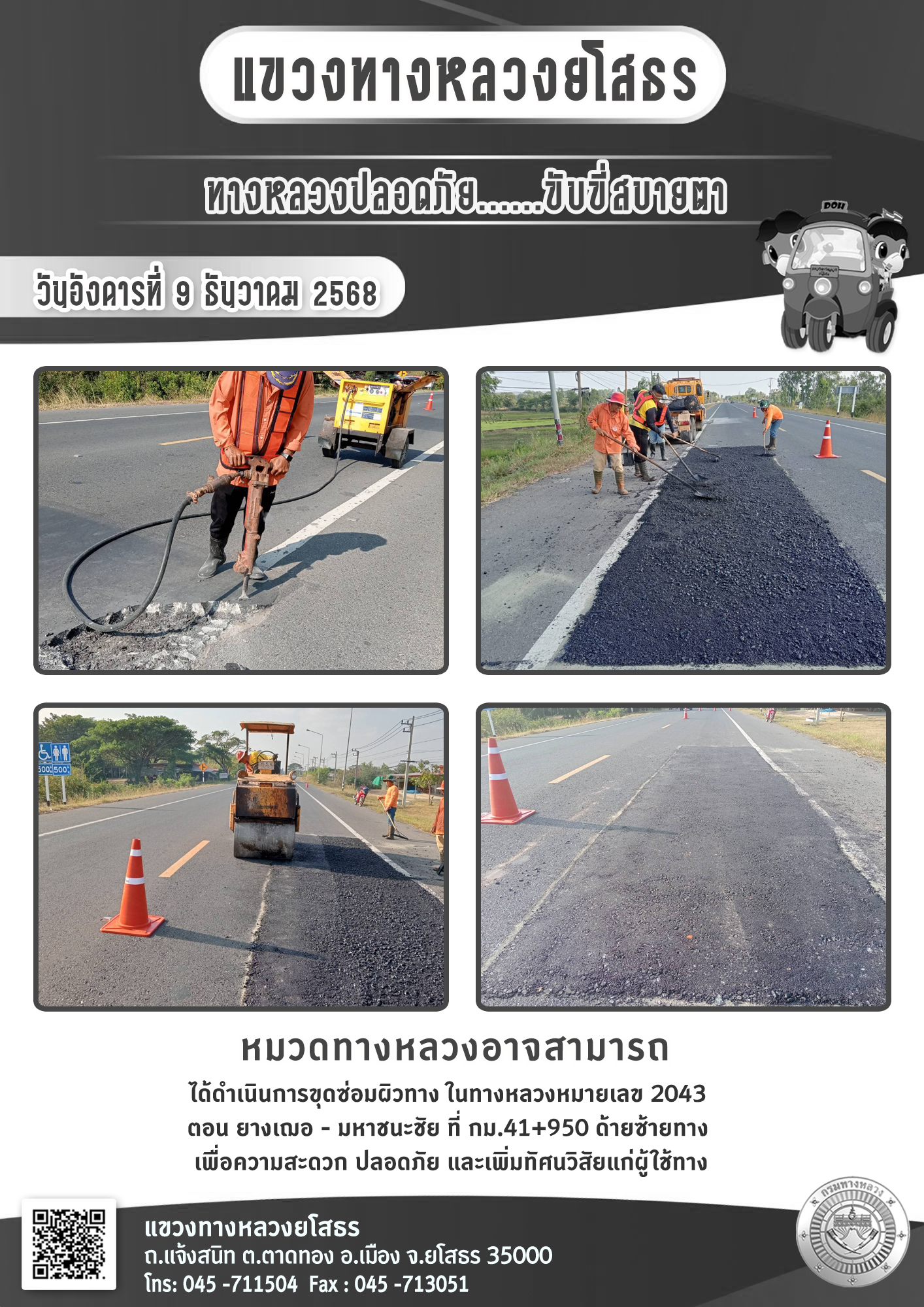วันอังคารที่ 9 ธันวาคม 2568 หมวดทางหลวงอาจสามารถ ได้ดำเนินการขุดซ่อมผิวทาง ในทางหลวงหมายเลข 2043 ตอน ยางเฌอ - มหาชนะชัย ที่ กม.41+950 ด้านซ้ายทาง เพื่อความสะดวก ปลอดภัย และเพิ่มทัศนวิสัยแก่ผู้ใช้ทาง