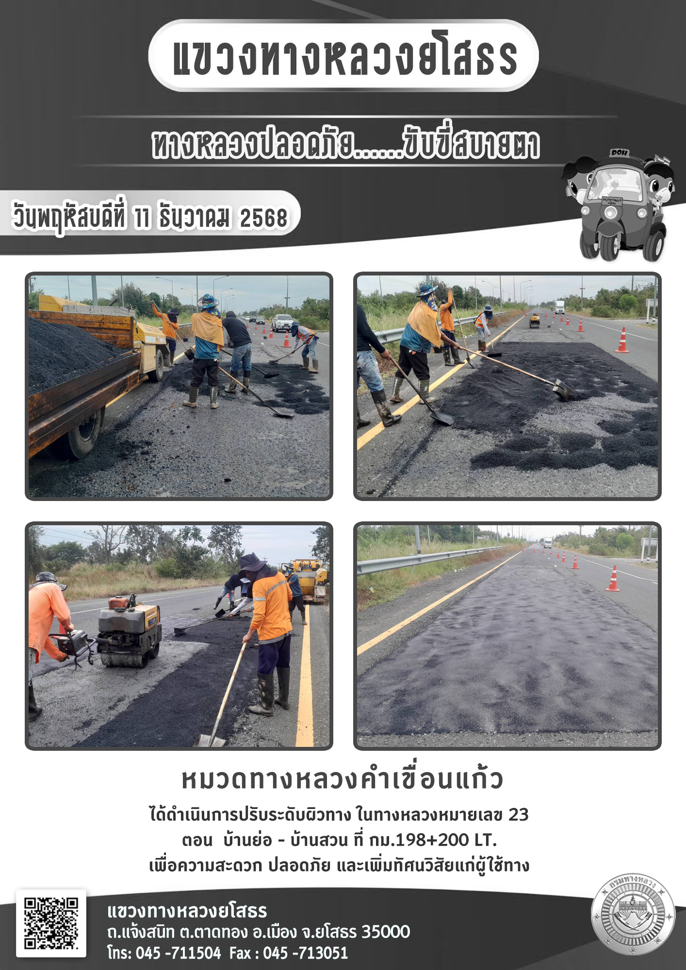 วันพฤหัสบดีที่ 11 ธันวาคม 2568 หมวดทางหลวงคำเขื่อนแก้ว ได้ดำเนินการปรับระดับผิวทาง ในทางหลวงหมายเลข 23 ตอน บ้านย่อ - บ้านสวน ที่ กม.198+200 LT. เพื่อความสะดวก ปลอดภัย และเพิ่มทัศนวิสัยแก่ผู้ใช้ทาง