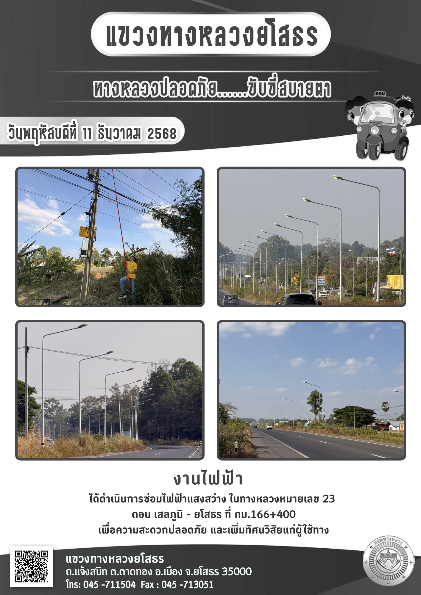 วันพฤหัสบดีที่ 11 ธันวาคม 2568 งานไฟฟ้า ได้ดำเนินการซ่อมไฟฟ้าแสงสว่าง ในทางหลวงหมายเลข 23 ตอน เสลภูมิ - ยโสธร ที่ กม.166+400 เพื่อความสะดวกปลอดภัย และเพิ่มทัศนวิสัยแก่ผู้ใช้ทาง