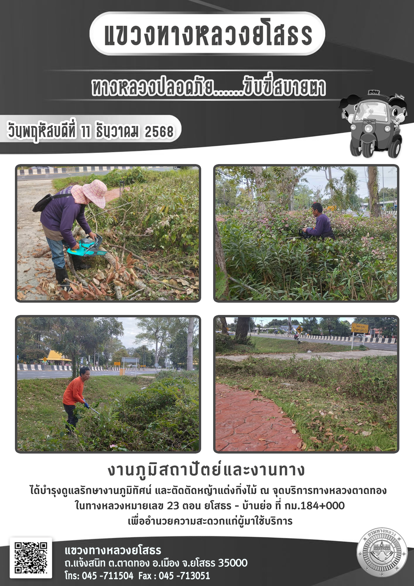วันพฤหัสบดีที่ 11 ธันวาคม 2568 งานภูมิสถาปัตย์และงานทาง ได้บำรุงดูแลรักษางานภูมิทัศน์ และตัดตัดหญ้าแต่งกิ่งไม้ ณ จุดบริการทางหลวงตาดทอง ในทางหลวงหมายเลข 23 ตอน ยโสธร - บ้านย่อ ที่ กม.184+000 เพื่ออำนวยความสะดวกแก่ผู้มาใช้บริการ