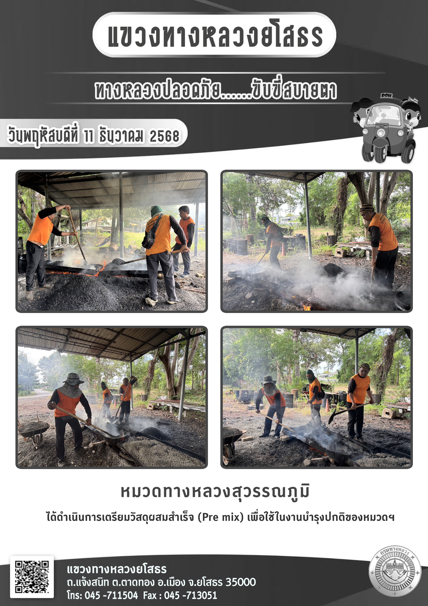 วันพฤหัสบดีที่ 11 ธันวาคม 2568 หมวดทางหลวงสุวรรณภูมิ ได้ดำเนินการเตรียมวัสดุผสมสำเร็จ (Pre mix) เพื่อใช้ในงานบำรุงปกติของหมวดฯ