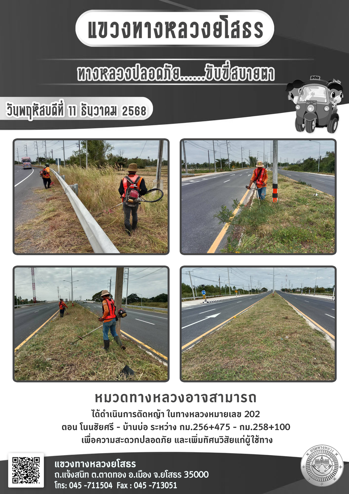 วันพฤหัสบดีที่ 11 ธันวาคม 2568 หมวดทางหลวงอาจสามารถ ได้ดำเนินการตัดหญ้า ในทางหลวงหมายเลข 202 ตอน โนนชัยศรี - บ้านบ่อ ระหว่าง กม.256+475 - กม.258+100 เพื่อความสะดวกปลอดภัย และเพิ่มทัศนวิสัยแก่ผู้ใช้ทาง