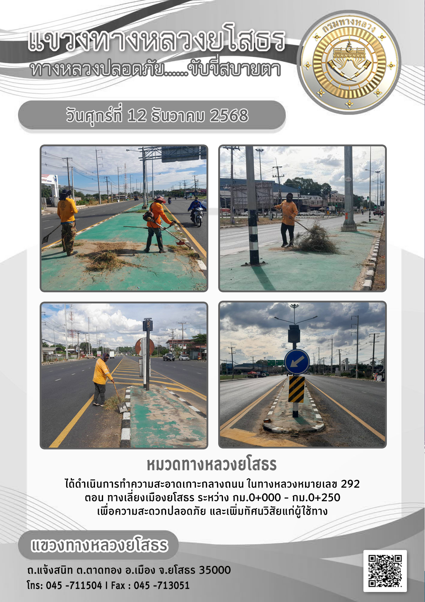 วันศุกร์ที่ 12 ธันวาคม 2568 หมวดทางหลวงยโสธร ได้ดำเนินการทำความสะอาดเกาะกลางถนน ในทางหลวงหมายเลข 292 ตอน ทางเลี่ยงเมืองยโสธร ระหว่าง กม.0+000 - กม.0+250 เพื่อความสะดวกปลอดภัย และเพิ่มทัศนวิสัยแก่ผู้ใช้ทาง
