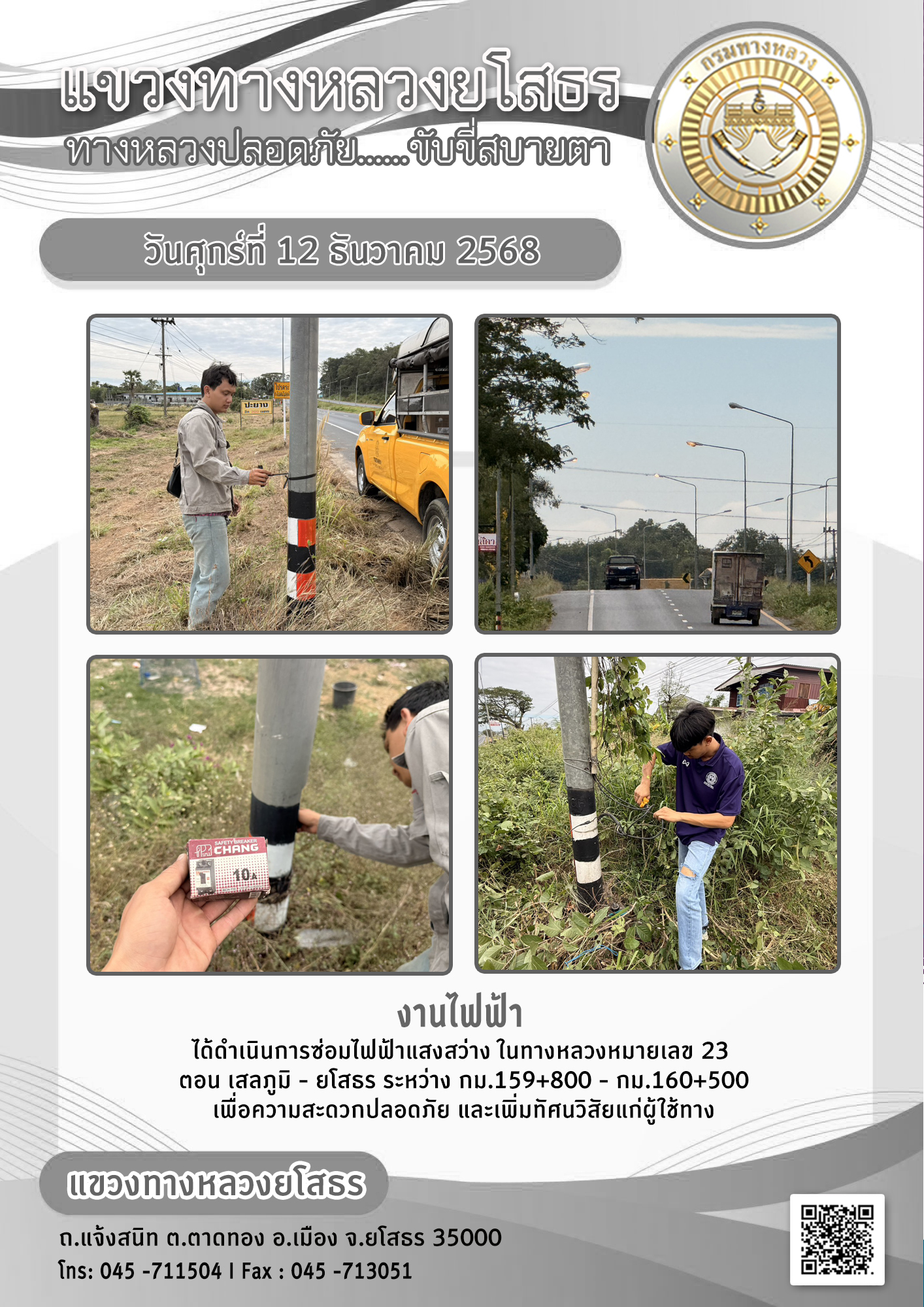 วันศุกร์ที่ 12 ธันวาคม 2568 งานไฟฟ้า ได้ดำเนินการซ่อมไฟฟ้าแสงสว่าง ในทางหลวงหมายเลข 23 ตอน เสลภูมิ - ยโสธร ระหว่าง กม.159+800 - กม.160+500 เพื่อความสะดวกปลอดภัย และเพิ่มทัศนวิสัยแก่ผู้ใช้ทาง