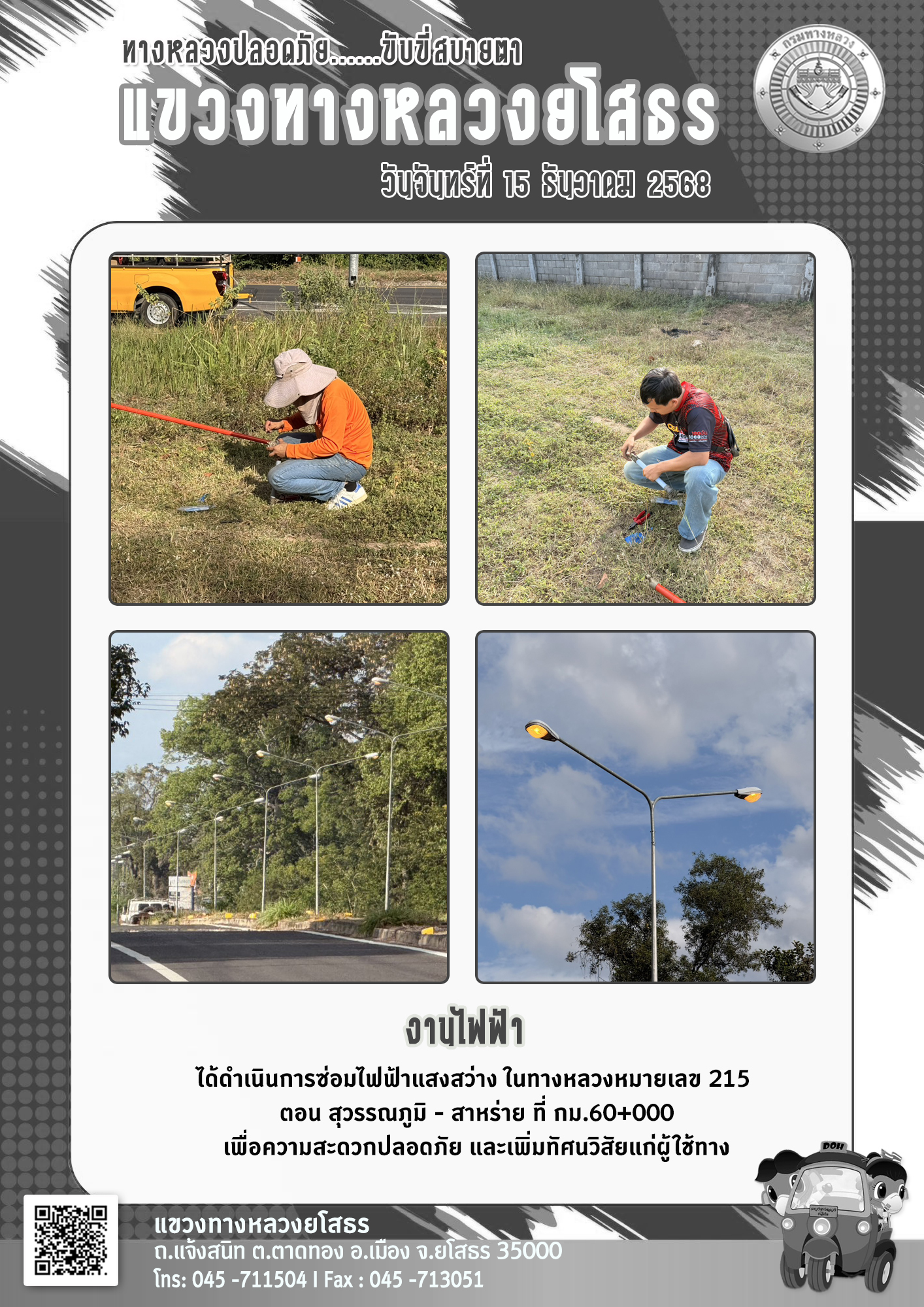 วันจันทร์ที่ 15 ธันวาคม 2568 งานไฟฟ้า ได้ดำเนินการซ่อมไฟฟ้าแสงสว่าง ในทางหลวงหมายเลข 215 ตอน สุวรรณภูมิ - สาหร่าย ที่ กม.60+000 เพื่อความสะดวกปลอดภัย และเพิ่มทัศนวิสัยแก่ผู้ใช้ทาง