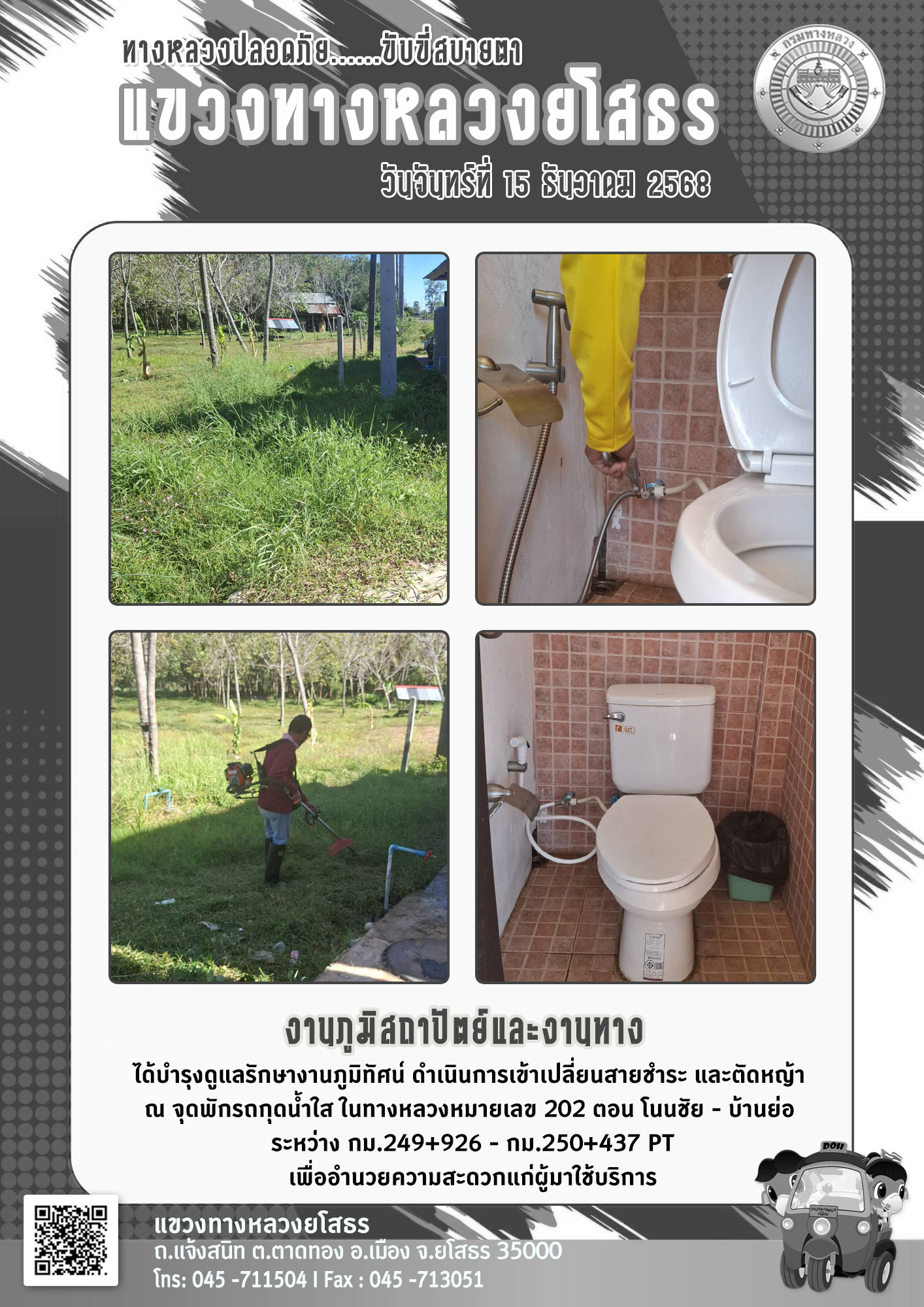 วันจันทร์ที่ 15 ธันวาคม 2568 งานภูมิสถาปัตย์และงานทาง ได้บำรุงดูแลรักษางานภูมิทัศน์ ดำเนินการเข้าเปลี่ยนสายชำระ และตัดหญ้า ณ จุดพักรถกุดน้ำใส ในทางหลวงหมายเลข 202 ตอน โนนชัย - บ้านย่อ ระหว่าง กม.249+926 - กม.250+437 เพื่ออำนวยความสะดวกแก่ผู้มาใช้บริก