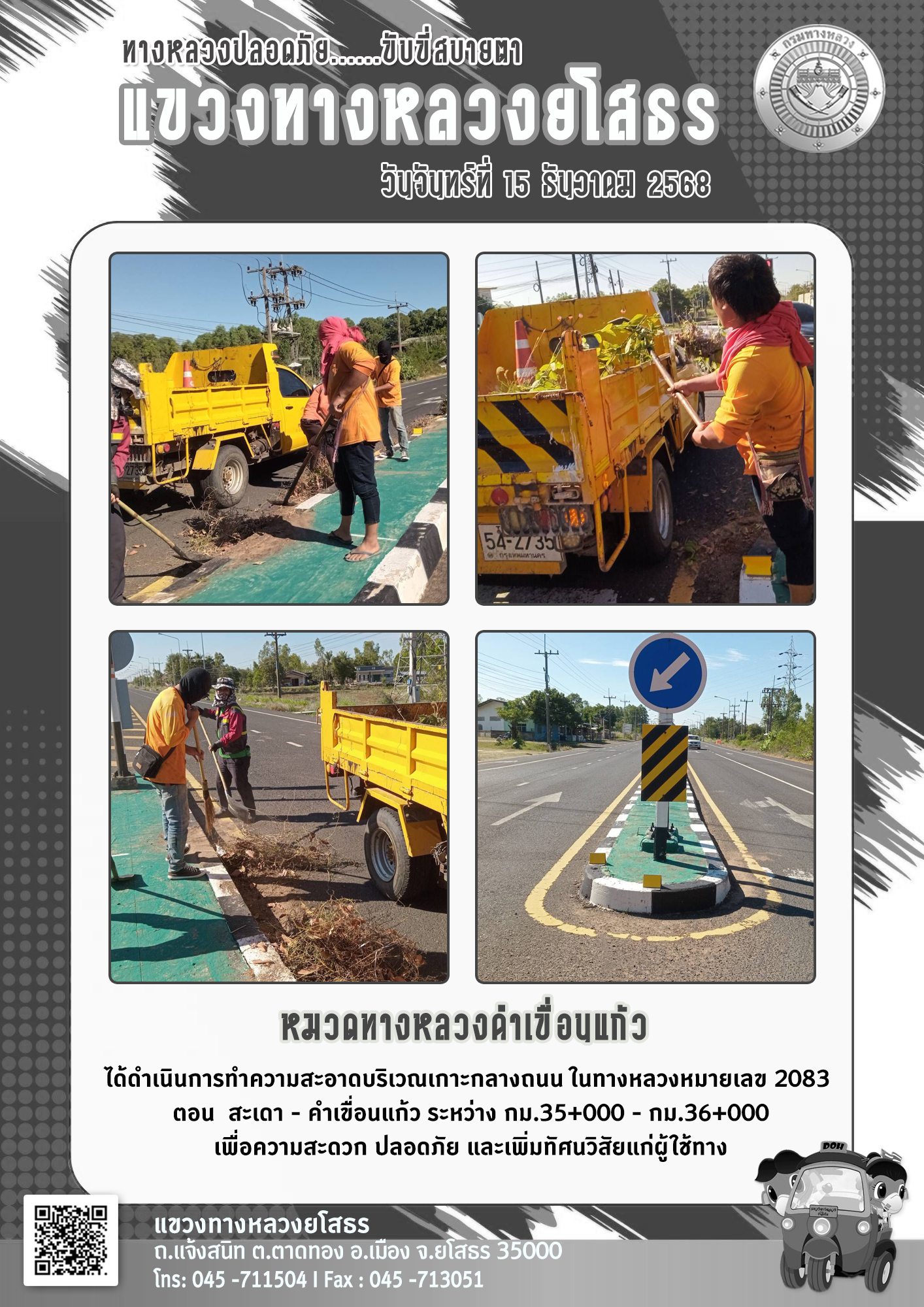 วันจันทร์ที่ 15 ธันวาคม 2568 หมวดทางหลวงคำเขื่อนแก้ว ได้ดำเนินการทำความสะอาดบริเวณเกาะกลางถนน ในทางหลวงหมายเลข 2083 ตอน สะเดา - คำเขื่อนแก้ว ระหว่าง กม.35+000 - กม.36+000 เพื่อความสะดวก ปลอดภัย และเพิ่มทัศนวิสัยแก่ผู้ใช้ทาง