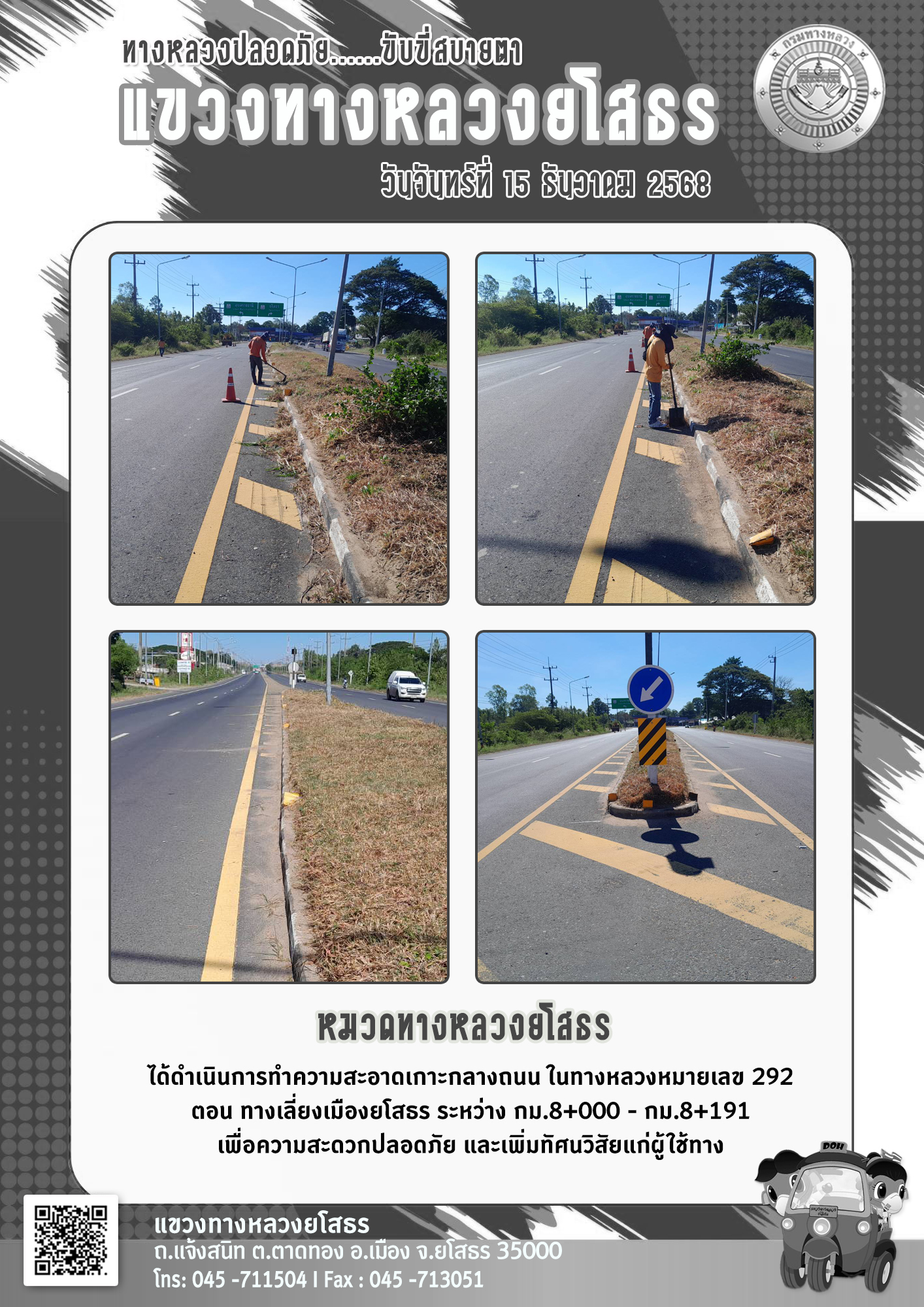 วันจันทร์ที่ 15 ธันวาคม 2568 หมวดทางหลวงยโสธร ได้ดำเนินการทำความสะอาดเกาะกลางถนน ในทางหลวงหมายเลข 292 ตอน ทางเลี่ยงเมืองยโสธร ระหว่าง กม.8+000 - กม.8+191 เพื่อความสะดวกปลอดภัย และเพิ่มทัศนวิสัยแก่ผู้ใช้ทาง