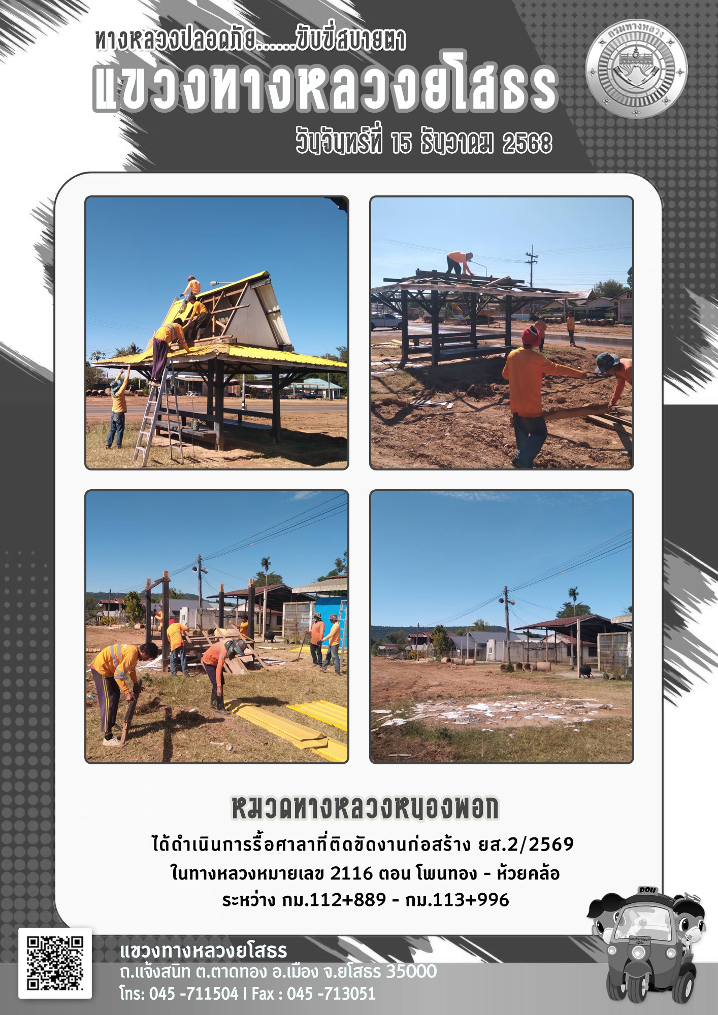 วันจันทร์ที่ 15 ธันวาคม 2568 หมวดทางหลวงหนองพอก ได้ดำเนินการรื้อถอนศาลาที่ติดขัดงานก่อสร้าง ยส.2/2569 ในทางหลวงหมายเลข 2116 ตอน โพนทอง - ห้วยคล้อ ระหว่าง กม.112+889 - กม.113+996