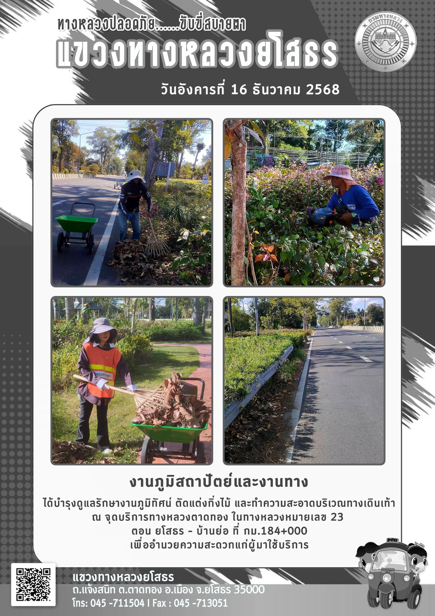 วันอังคารที่ 16 ธันวาคม 2568 งานภูมิสถาปัตย์และงานทาง ได้บำรุงดูแลรักษางานภูมิทัศน์ ตัดแต่งกิ่งไม้ และทำความสะอาดบริเวณทางเดินเท้า ณ จุดบริการทางหลวงตาดทอง ในทางหลวงหมายเลข 23 ตอน ยโสธร - บ้านย่อ ที่ กม.184+000 เพื่ออำนวยความสะดวกแก่ผู้มาใช้บริการ