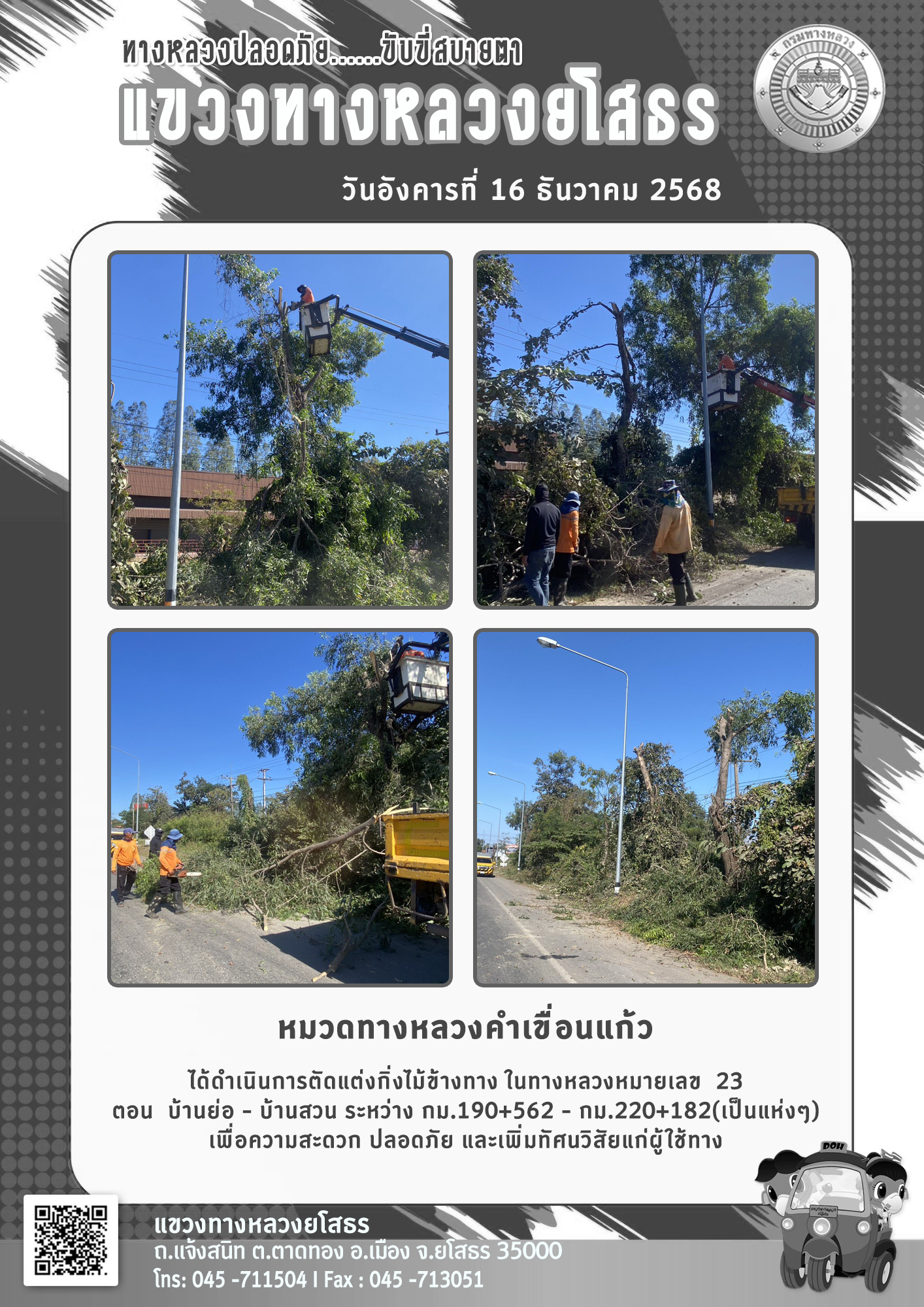 วันอังคารที่ 16 ธันวาคม 2568 หมวดทางหลวงคำเขื่อนแก้ว ได้ดำเนินการตัดแต่งกิ่งไม้ข้างทาง ในทางหลวงหมายเลข 23 ตอน บ้านย่อ - บ้านสวน ระหว่าง กม.190+562 - กม.220+182(เป็นแห่งๆ) เพื่อความสะดวก ปลอดภัย และเพิ่มทัศนวิสัยแก่ผู้ใช้ทาง
