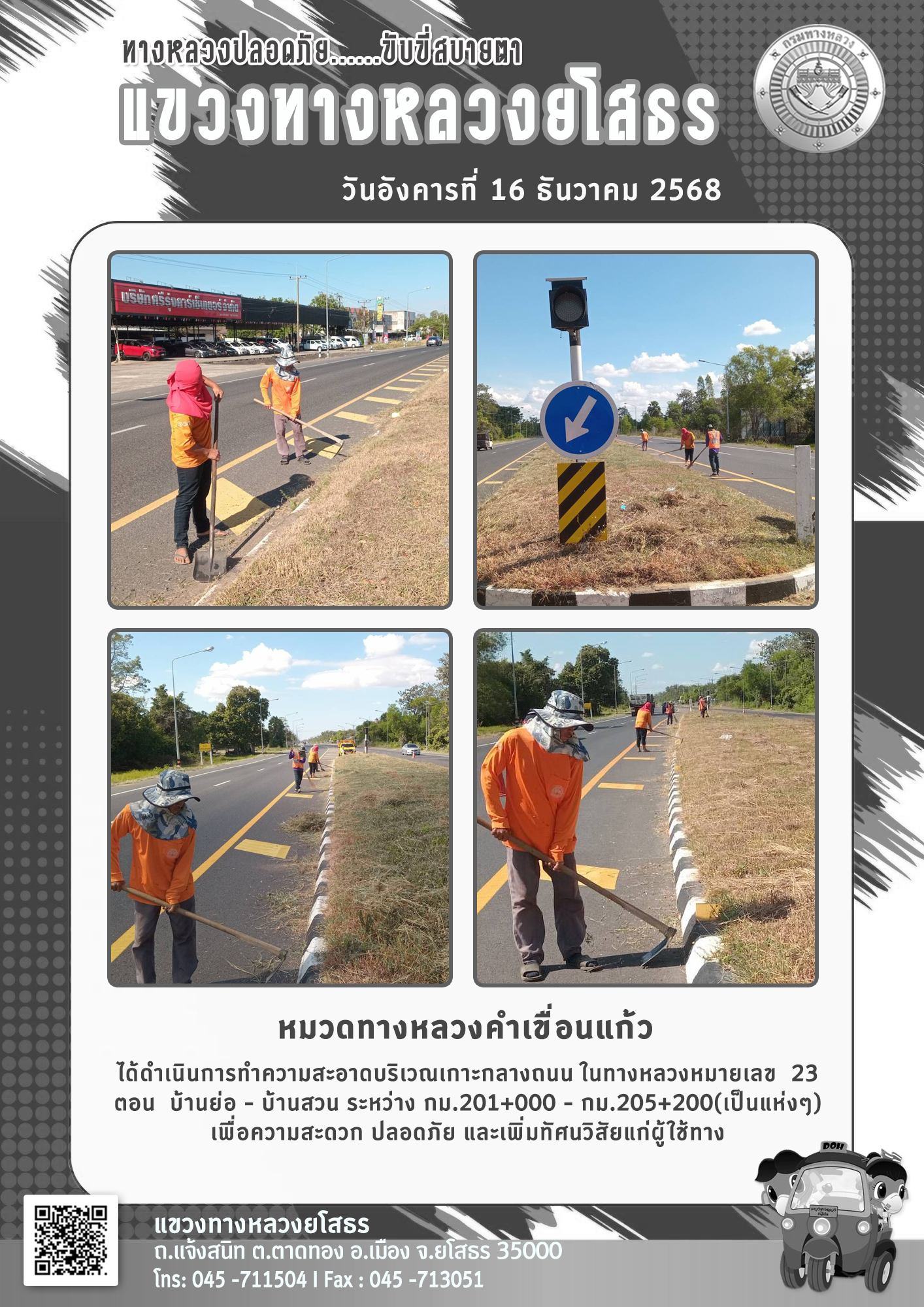 วันอังคารที่ 16 ธันวาคม 2568 หมวดทางหลวงคำเขื่อนแก้ว ได้ดำเนินการทำความสะอาดบริเวณเกาะกลางถนน ในทางหลวงหมายเลข 23 ตอน บ้านย่อ - บ้านสวน ระหว่าง กม.201+000 - กม.205+200(เป็นแห่งๆ) เพื่อความสะดวก ปลอดภัย และเพิ่มทัศนวิสัยแก่ผู้ใช้ทาง