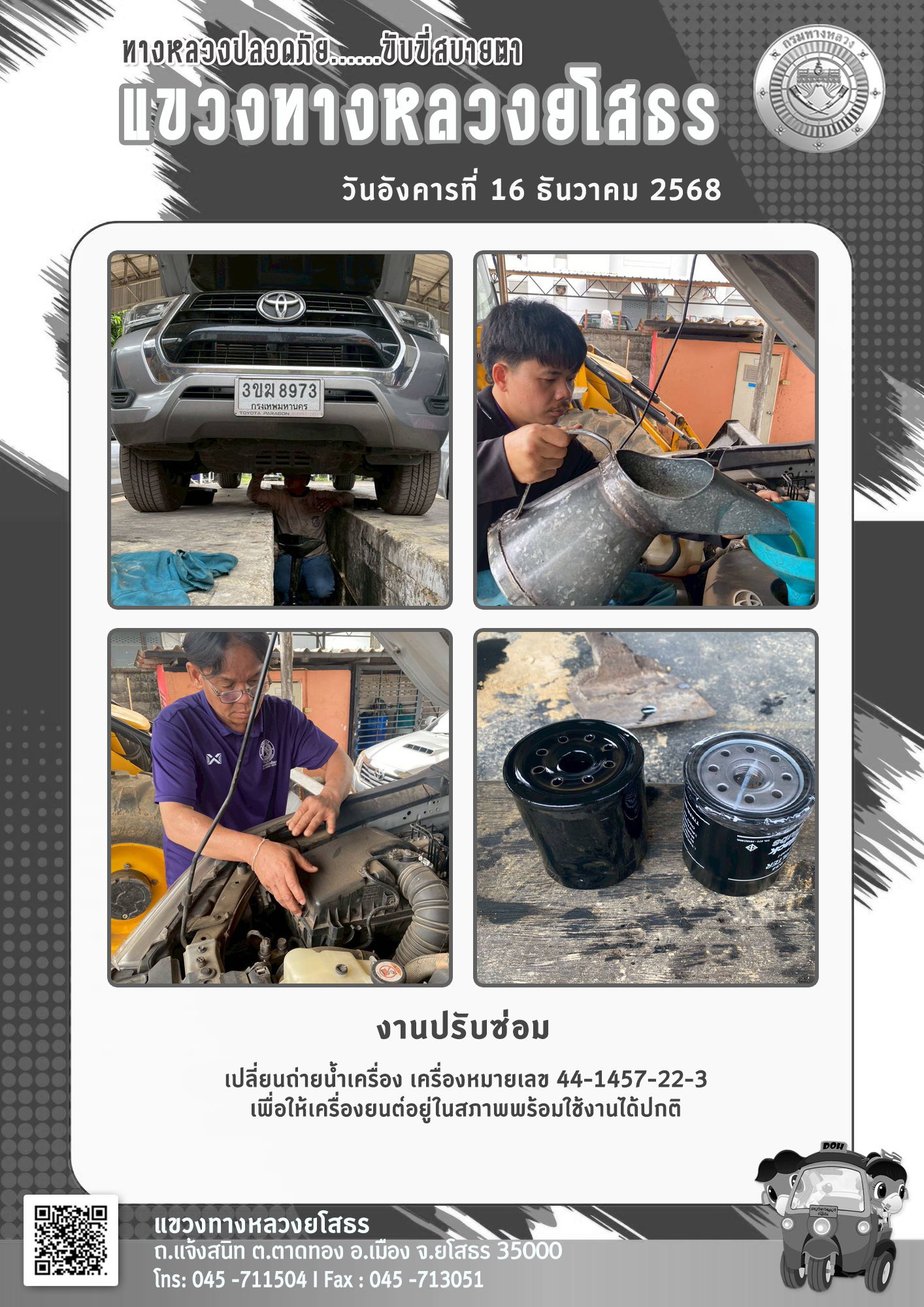 วันอังคารที่ 16 ธันวาคม 2568 งานปรับซ่อม เปลี่ยนถ่ายน้ำเครื่อง เครื่องหมายเลข 44-1457-22-3 เพื่อให้เครื่องยนต์อยู่ในสภาพพร้อมใช้งานได้ปกติ