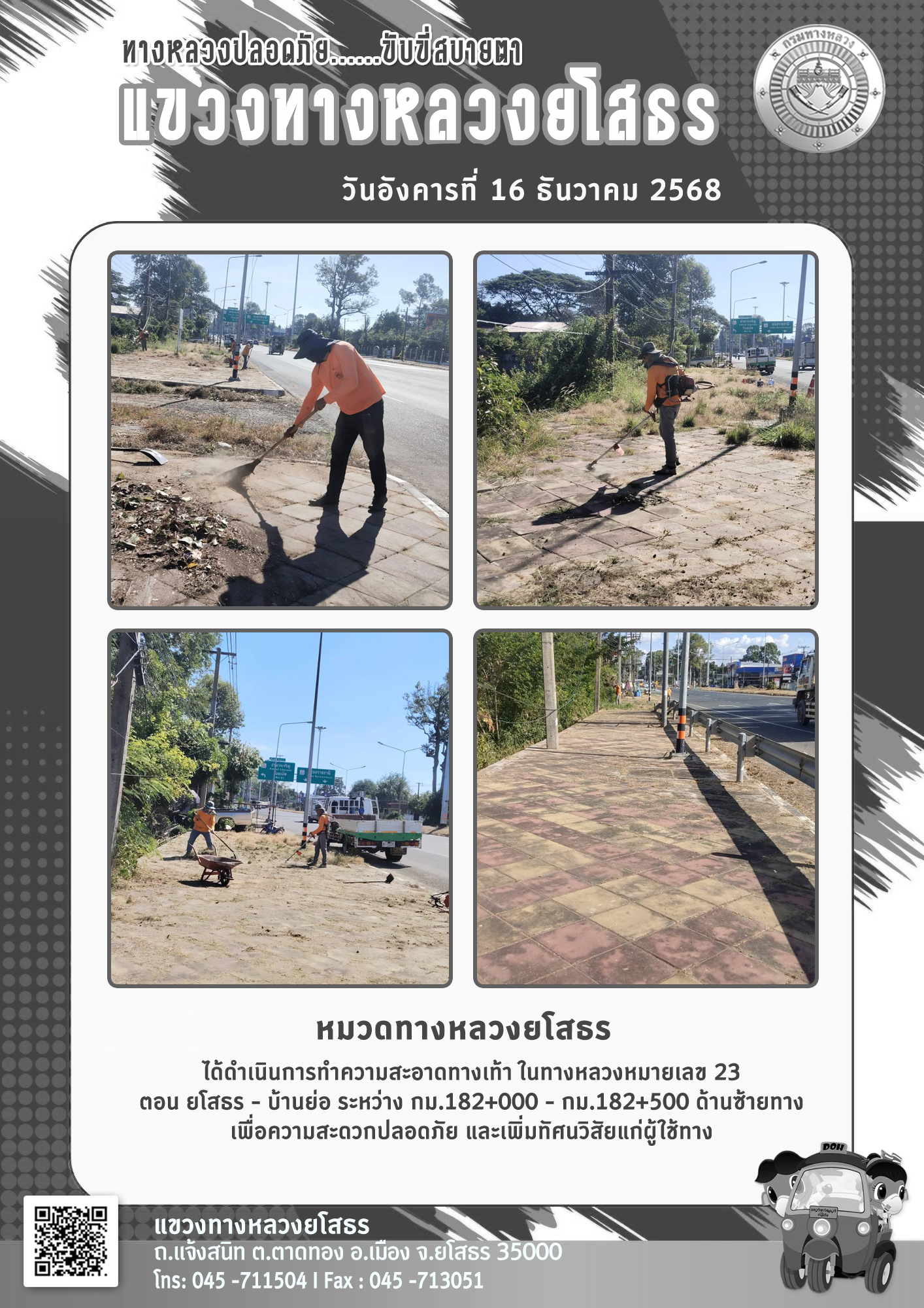 วันอังคารที่ 16 ธันวาคม 2568 หมวดทางหลวงยโสธร ได้ดำเนินการทำความสะอาดทางเท้า ในทางหลวงหมายเลข 23 ตอน ยโสธร - บ้านย่อ ระหว่าง กม.182+000 - กม.182+500 ด้านซ้ายทาง เพื่อความสะดวกปลอดภัย และเพิ่มทัศนวิสัยแก่ผู้ใช้ทาง