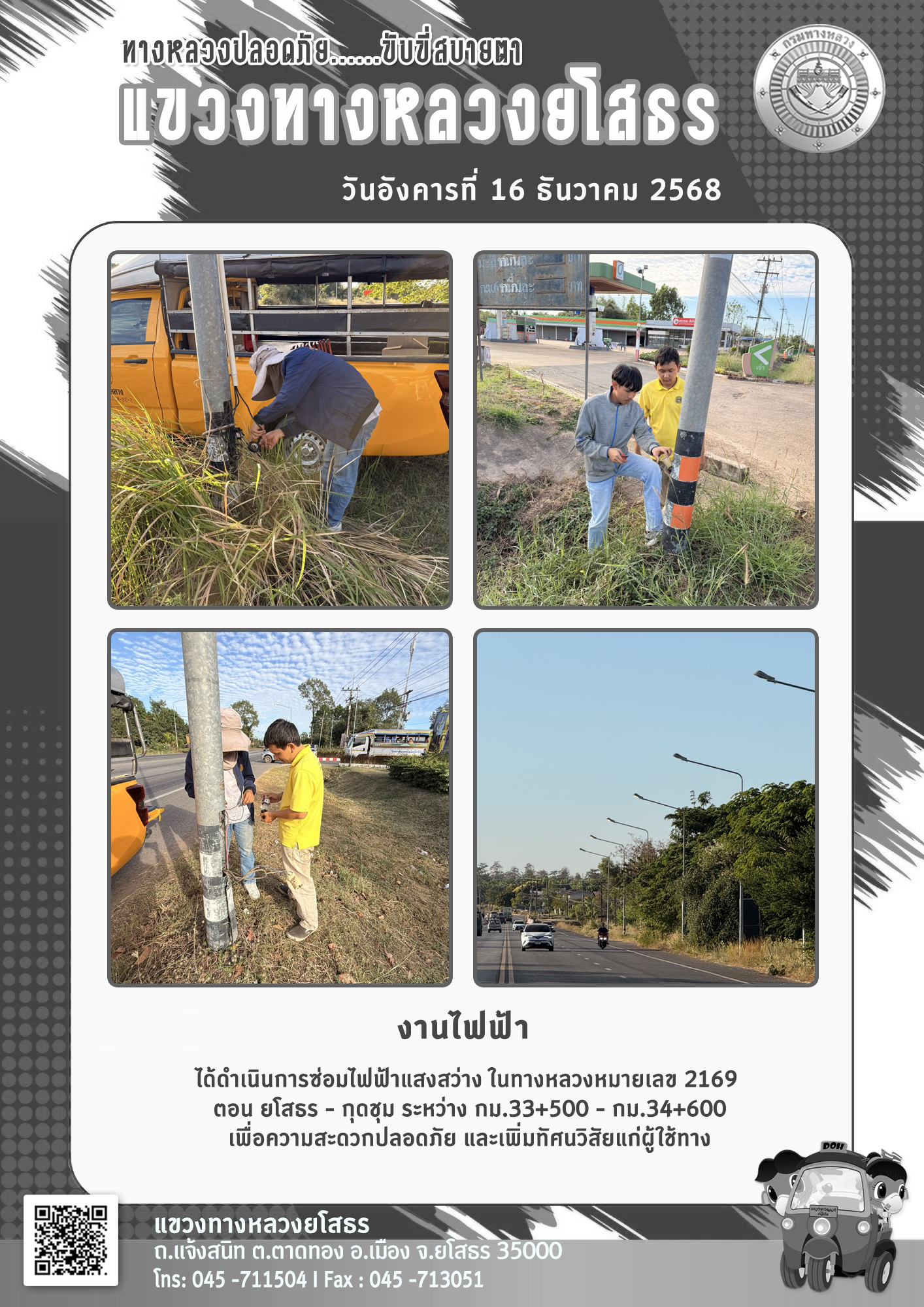 วันอังคารที่ 16 ธันวาคม 2568 งานไฟฟ้า ได้ดำเนินการซ่อมไฟฟ้าแสงสว่าง ในทางหลวงหมายเลข 2169 ตอน ยโสธร - กุดชุม ระหว่าง กม.33+500 - กม.34+600 เพื่อความสะดวกปลอดภัย และเพิ่มทัศนวิสัยแก่ผู้ใช้ทาง
