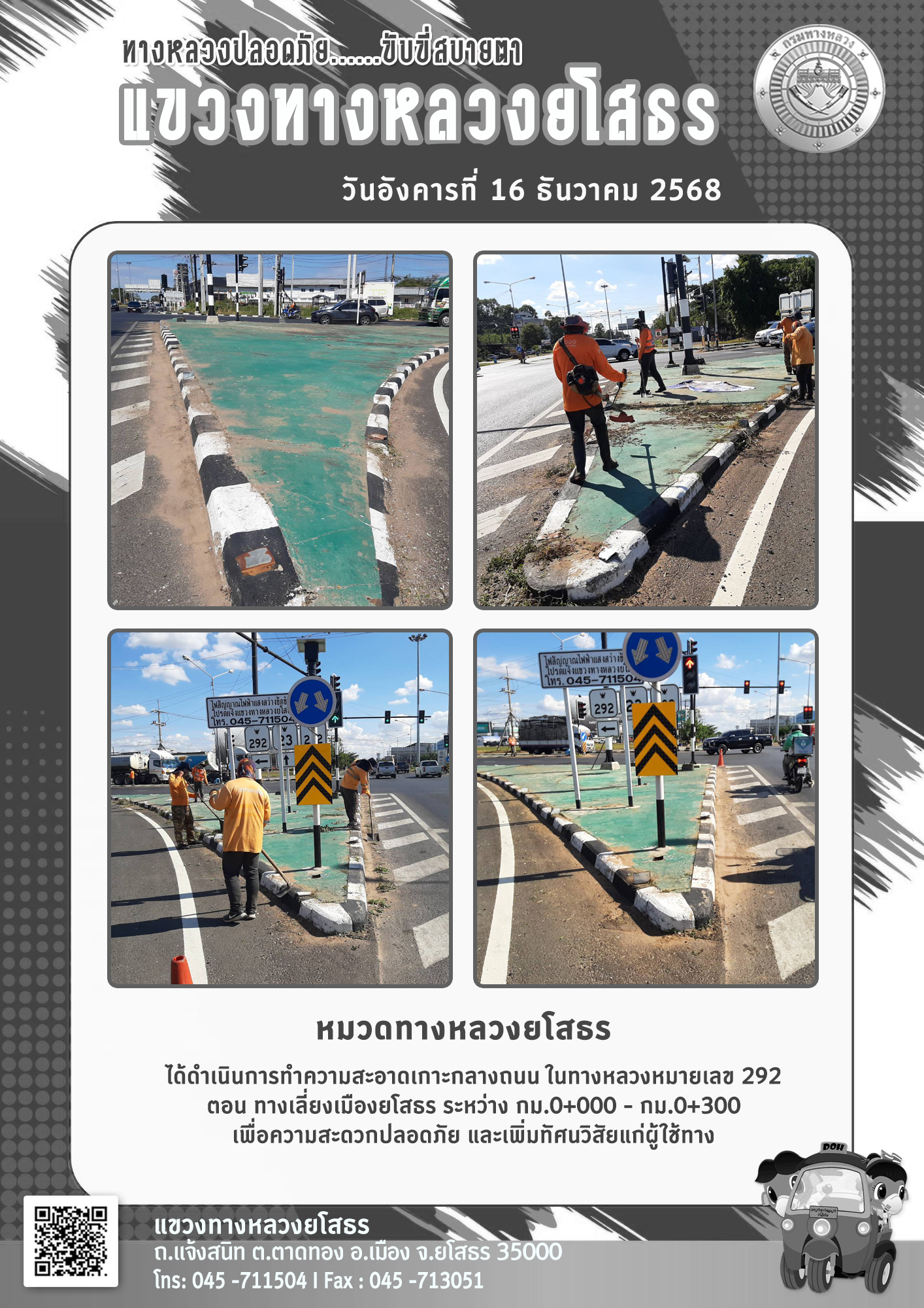 วันอังคารที่ 16 ธันวาคม 2568 หมวดทางหลวงยโสธร ได้ดำเนินการทำความสะอาดเกาะกลางถนน ในทางหลวงหมายเลข 292 ตอน ทางเลี่ยงเมืองยโสธร ระหว่าง กม.0+000 - กม.0+300 เพื่อความสะดวกปลอดภัย และเพิ่มทัศนวิสัยแก่ผู้ใช้ทาง
