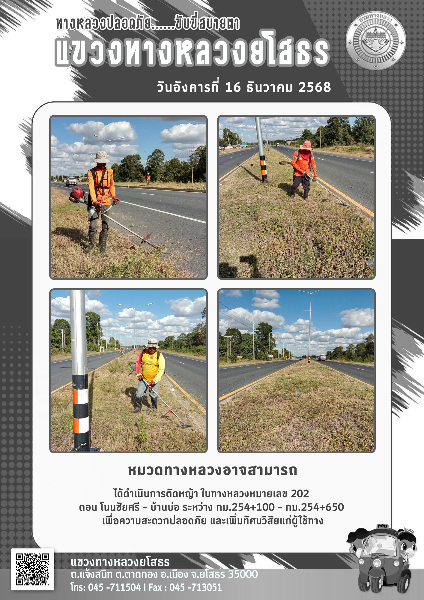 วันอังคารที่ 16 ธันวาคม 2568 หมวดทางหลวงอาจสามารถ ได้ดำเนินการตัดหญ้า ในทางหลวงหมายเลข 202 ตอน โนนชัยศรี - บ้านบ่อ ระหว่าง กม.254+100 - กม.254+650 เพื่อความสะดวกปลอดภัย และเพิ่มทัศนวิสัยแก่ผู้ใช้ทาง