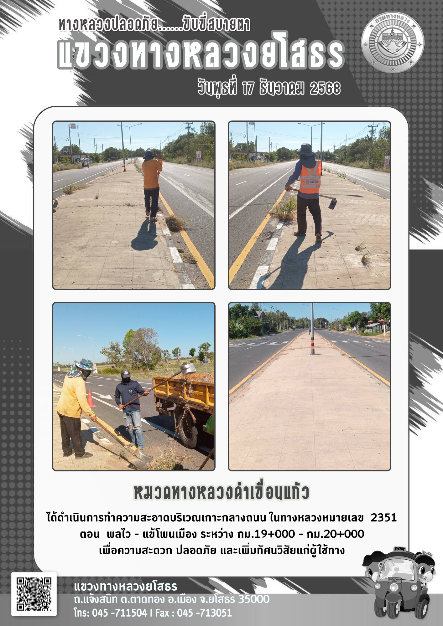 วันพุธที่ 17 ธันวาคม 2568 หมวดทางหลวงดำเขื่อนแก้ว ได้ดำเนินการทำความสะอาดบริเวณเกาะกลางถนน ในทางหลวงหมายเลข 2351 ตอน พลไว - แข้โพนเมือง ระหว่าง กม.19+000 - กม.20+000 เพื่อความสะดวก ปลอดภัย และเพิ่มทัศนวิสัยแก่ผู้ใช้ทาง