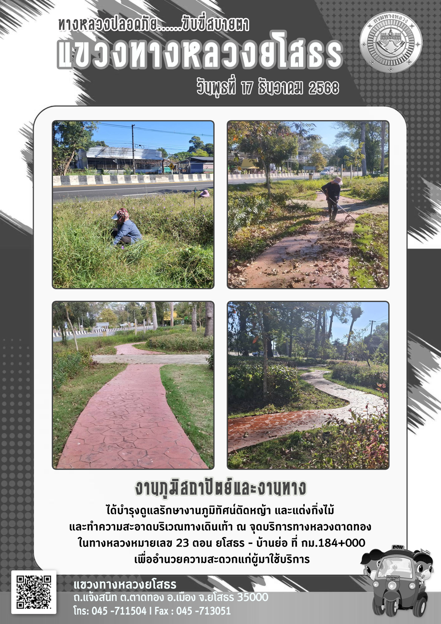 วันพุธที่ 17 ธันวาคม 2568 งานภูมิสถาปัตย์และงานทาง ได้บำรุงดูแลรักษางานภูมิทัศน์ตัดหญ้า และแต่งกิ่งไม้ และทำความสะอาดบริเวณทางเดินเท้า ณ จุดบริการทางหลวงตาดทอง ในทางหลวงหมายเลข 23 ตอน ยโสธร - บ้านย่อ ที่ กม.184+000 เพื่ออำนวยความสะดวกแก่ผู้มาใช้บริกา