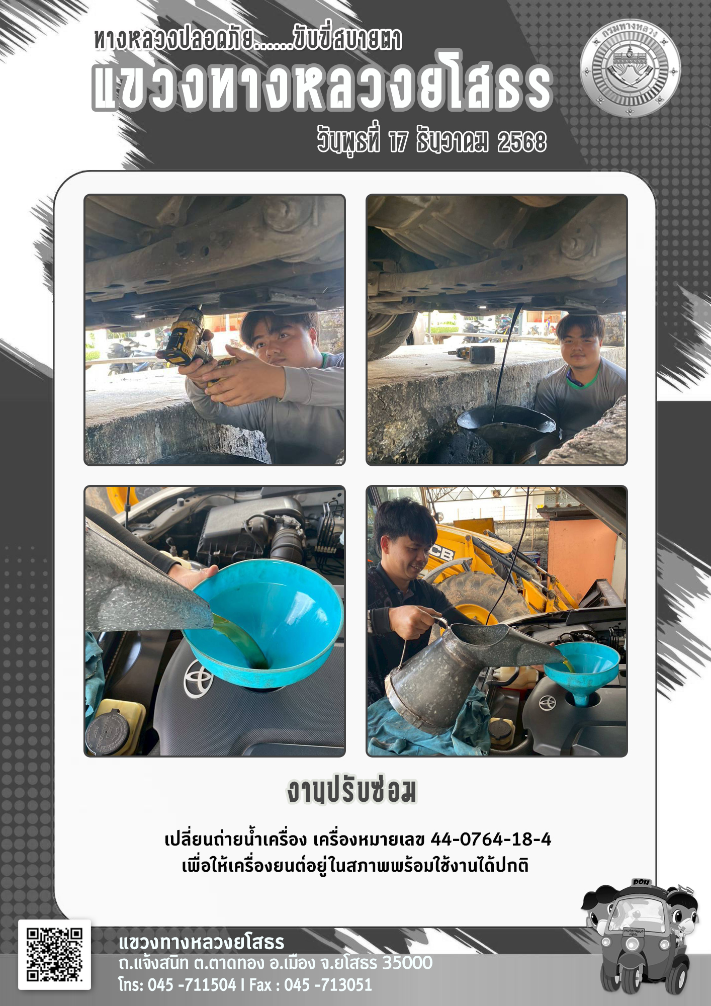 วันพุธที่ 17 ธันวาคม 2568 งานปรับซ่อม เปลี่ยนถ่ายน้ำเครื่อง เครื่องหมายเลข 44-0764-18-4 เพื่อให้เครื่องยนต์อยู่ในสภาพพร้อมใช้งานได้ปกติ