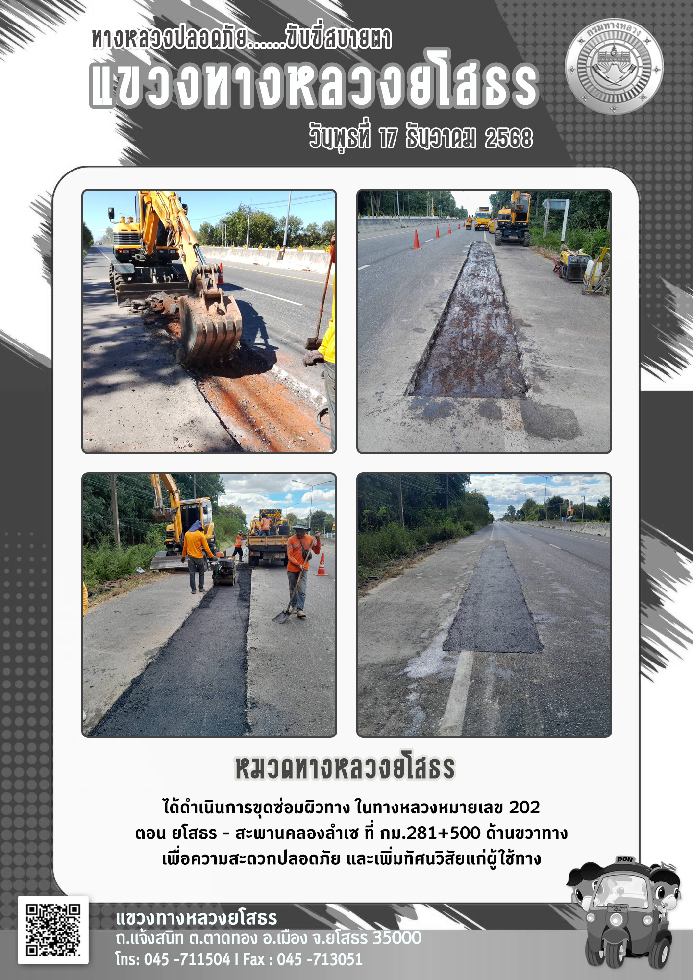 วันพุธที่ 17 ธันวาคม 2568 หมวดทางหลวงยโสธร ได้ดำเนินการขุดซ่อมผิวทาง ในทางหลวงหมายเลข 202 ตอน ยโสธร - สะพานคลองลำเซ ที่ กม.281+500 ด้านขวาทาง เพื่อความสะดวกปลอดภัย และเพิ่มทัศนวิสัยแก่ผู้ใช้ทาง