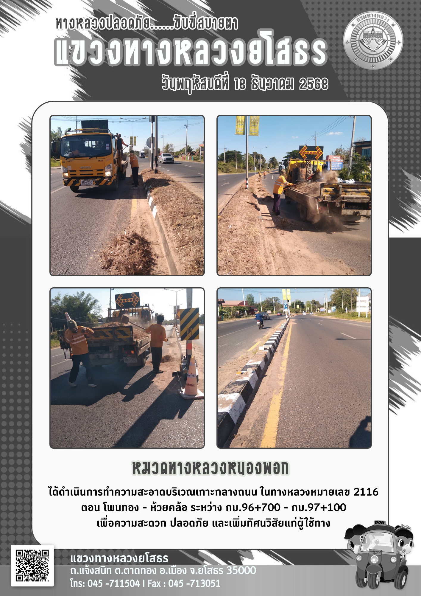 วันพฤหัสบดีที่ 18 ธันวาคม 2568 หมวดทางหลวงหนองพอก ได้ดำเนินการทำความสะอาดบริเวณเกาะกลางถนน ในทางหลวงหมายเลข 2116 ตอน โพนทอง - ห้วยคล้อ ระหว่าง กม.96+700 - กม.97+100 เพื่อความสะดวก ปลอดภัย และเพิ่มทัศนวิสัยแก่ผู้ใช้ทาง
