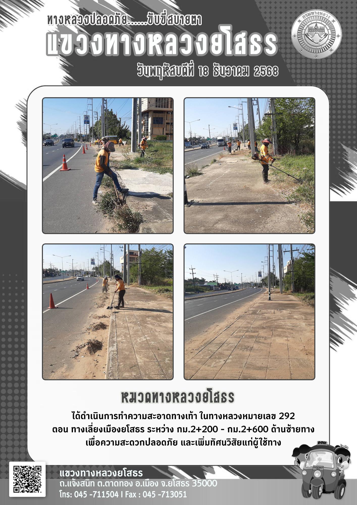 วันพฤหัสบดีที่ 18 ธันวาคม 2568 หมวดทางหลวงยโสธร ได้ดำเนินการทำความสะอาดทางเท้า ในทางหลวงหมายเลข 292 ตอน ทางเลี่ยงเมืองยโสธร ระหว่าง กม.2+200 - กม.2+600 ด้านซ้ายทาง เพื่อความสะดวกปลอดภัย และเพิ่มทัศนวิสัยแก่ผู้ใช้ทาง