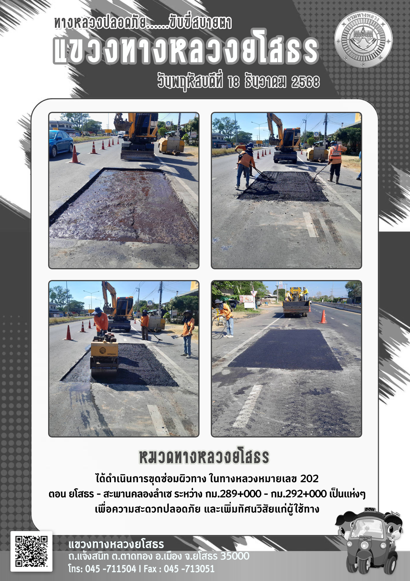 วันพฤหัสบดีที่ 18 ธันวาคม 2568 หมวดทางหลวงยโสธร ได้ดำเนินการขุดซ่อมผิวทาง ในทางหลวงหมายเลข 202 ตอน ยโสธร - สะพานคลองลำเซ ระหว่าง กม.289+000 - กม.292+000 เป็นเแห่งๆ เพื่อความสะดวกปลอดภัย และเพิ่มทัศนวิสัยแก่ผู้ใช้ทาง