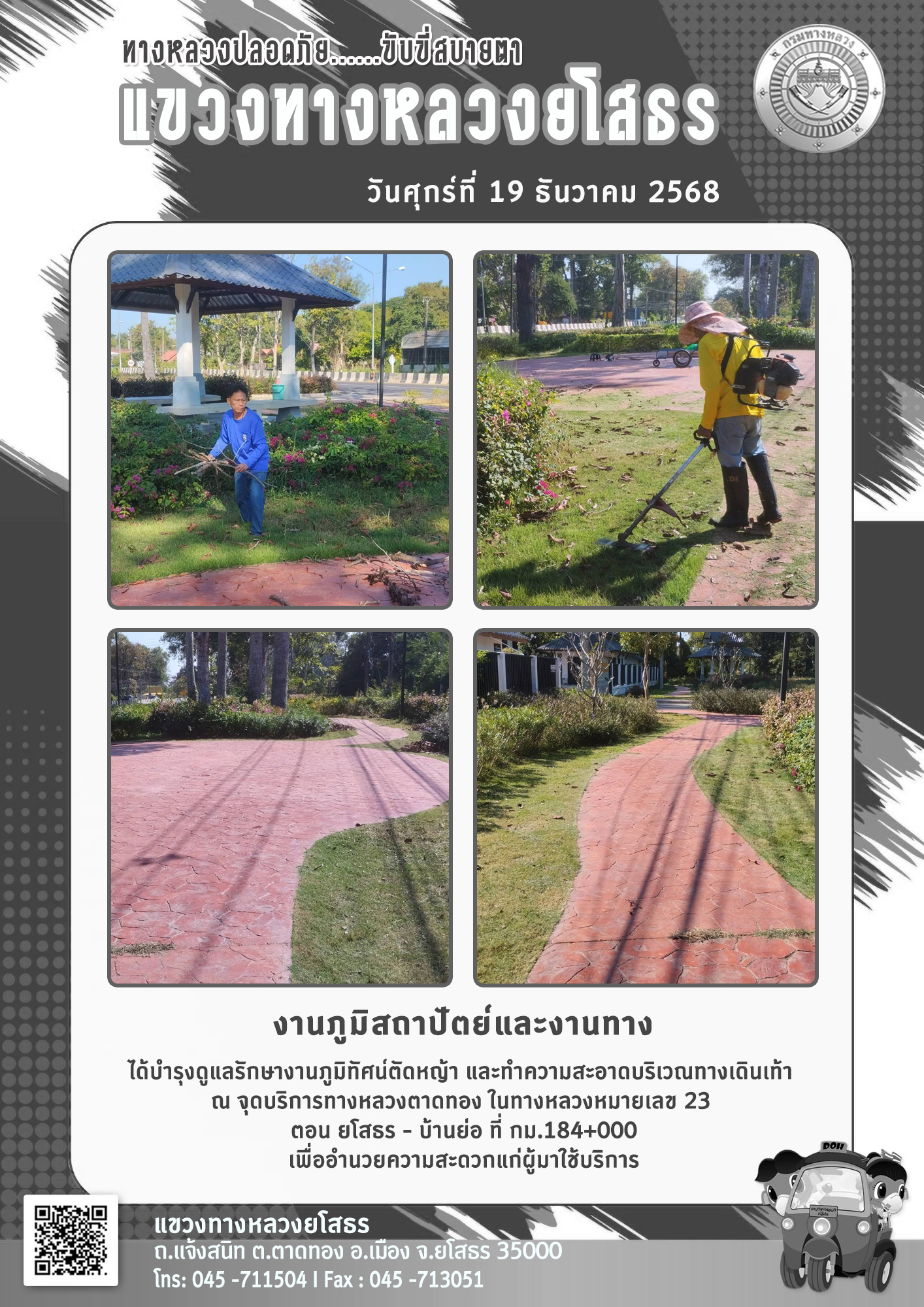 วันศุกร์ที่ 19 ธันวาคม 2568 งานภูมิสถาปัตย์และงานทาง ได้บำรุงดูแลรักษางานภูมิทัศน์ตัดหญ้า และทำความสะอาดบริเวณทางเดินเท้า ณ จุดบริการทางหลวงตาดทอง ในทางหลวงหมายเลซ 23 ตอน ยโสธร - บ้านย่อ ที่ กม.184+000 เพื่ออำนวยความสะดวกแก่ผู้มาใช้บริการ